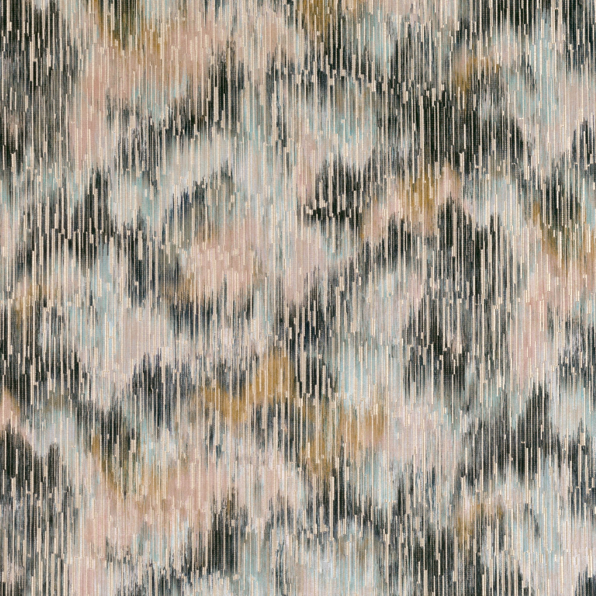 Tkanina Mizumi 01 Hanawa Jacquard to dramatyczny, żakardowy aksamit drukowany z rozmytym wzorem ikat. Bogaty w kolory, ten wzór jest przerywany przez błyski lśniącego metalicznego podłoża.
