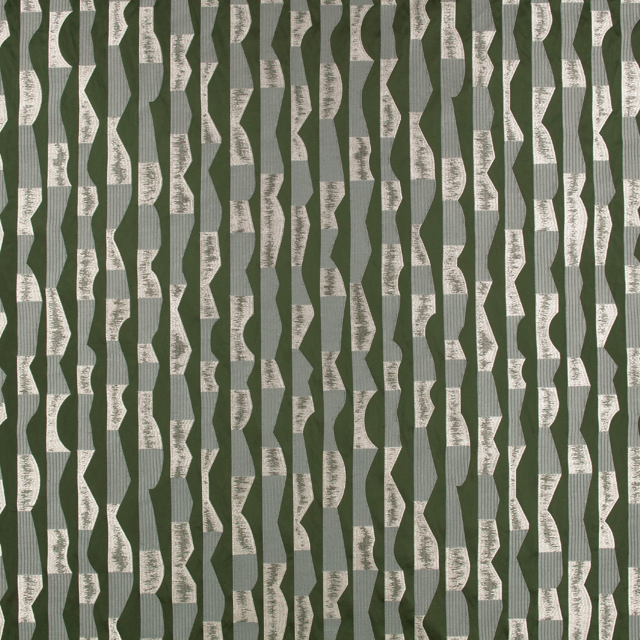 Tkanina Tabala 03 Ozari to tkanina o zdecydowanym charakterze. Perfekcyjnie wykonane, geometryczne bloki haftowane na gładkim satynie tworzą nowoczesny wzór w pasy.