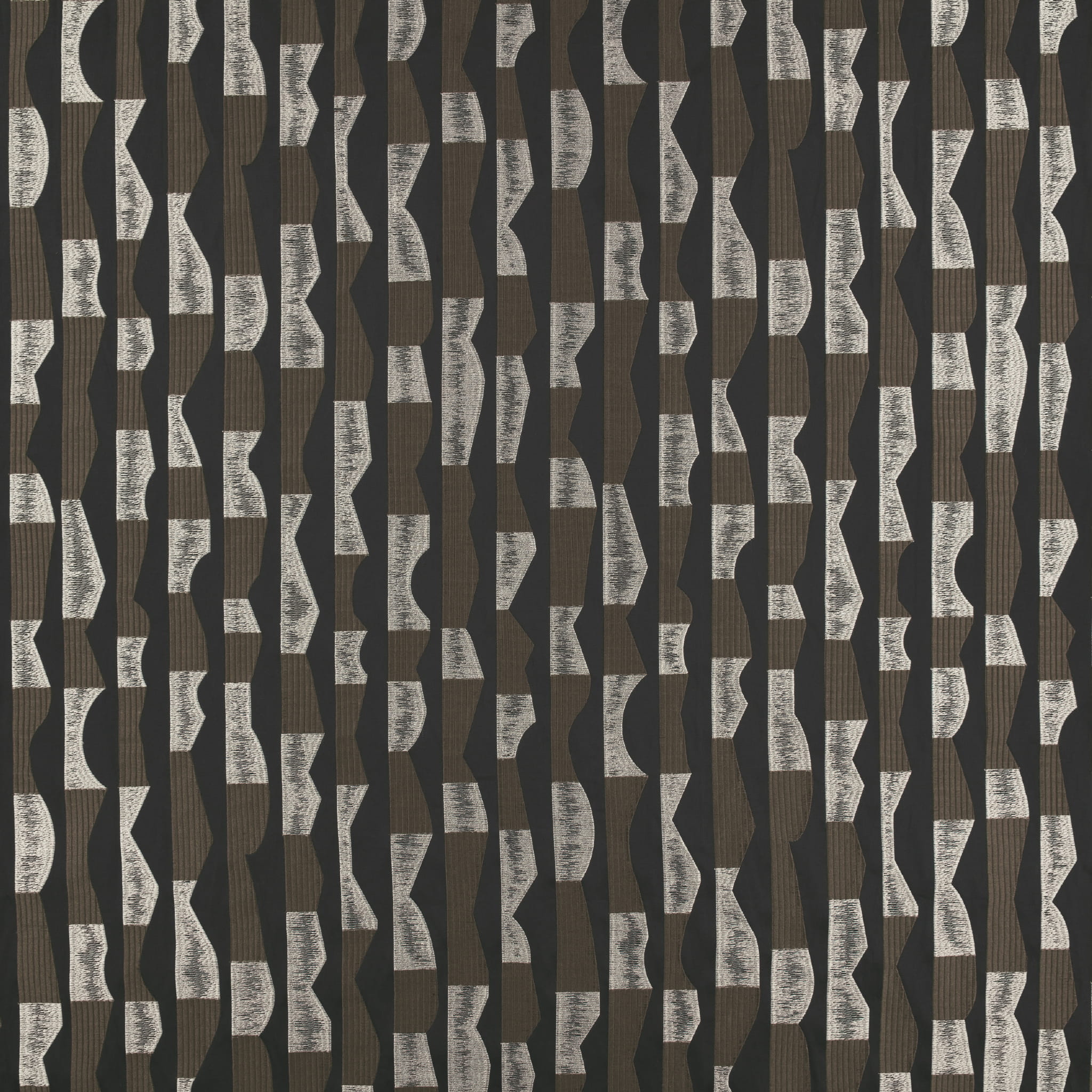 Tkanina Tabala 04 Ozari to tkanina o zdecydowanym charakterze. Perfekcyjnie wykonane, geometryczne bloki haftowane na gładkim satynie tworzą nowoczesny wzór w pasy.