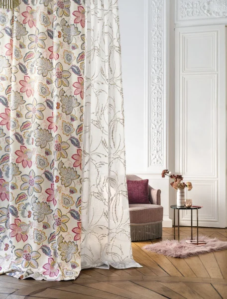 Tkanina Camengo Delicatesse 41650345 clemence ta haftowana tkanina to szeroki woal, który pozwala trawom wyrazić się w świetle. haft wykonany jest za pomocą dwóch nici: wiskozy dla blasku i bawełny dla objętości. ta kombinacja nadaje tkaninie niezwykłego blasku i wolumenu. całość tworzy harmonijną i wyrafinowaną kompozycję.