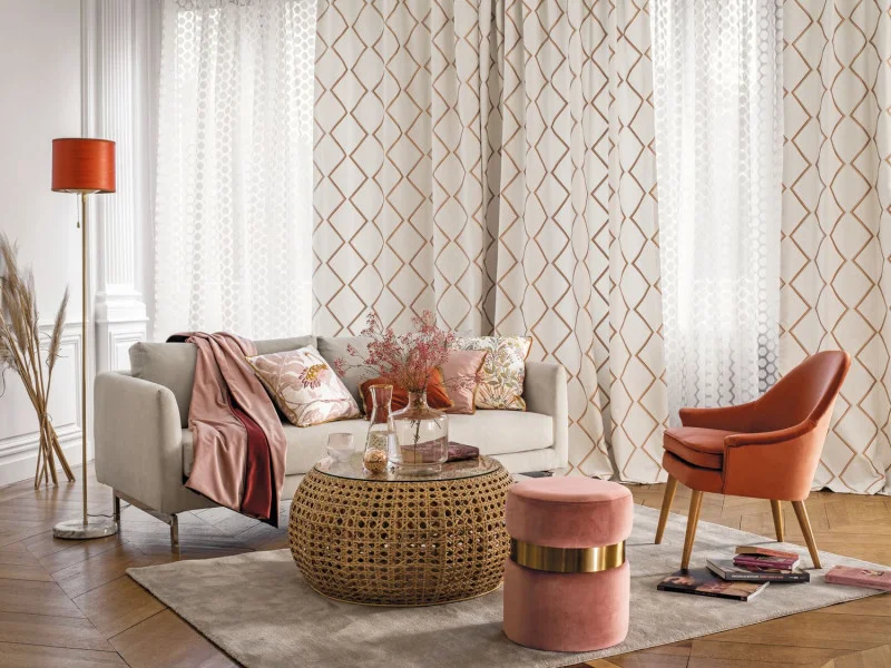 Tkanina Camengo Delicatesse 43410123 Okama składa się z sześciokątów, które są tkane za pomocą zwartego i wąskiego bawełnianego materiału. Kontrast z przejrzystością woalu jest wyraźny, złagodzony przez frędzle wokół każdego kształtu, dodające surowego dotyku i powietrznego odczucia. Wydaje się, że unoszą się na wietrze. Jest to unikalna tkanina, która dodaje lekkości i niepowtarzalnego charakteru każdemu wnętrzu.