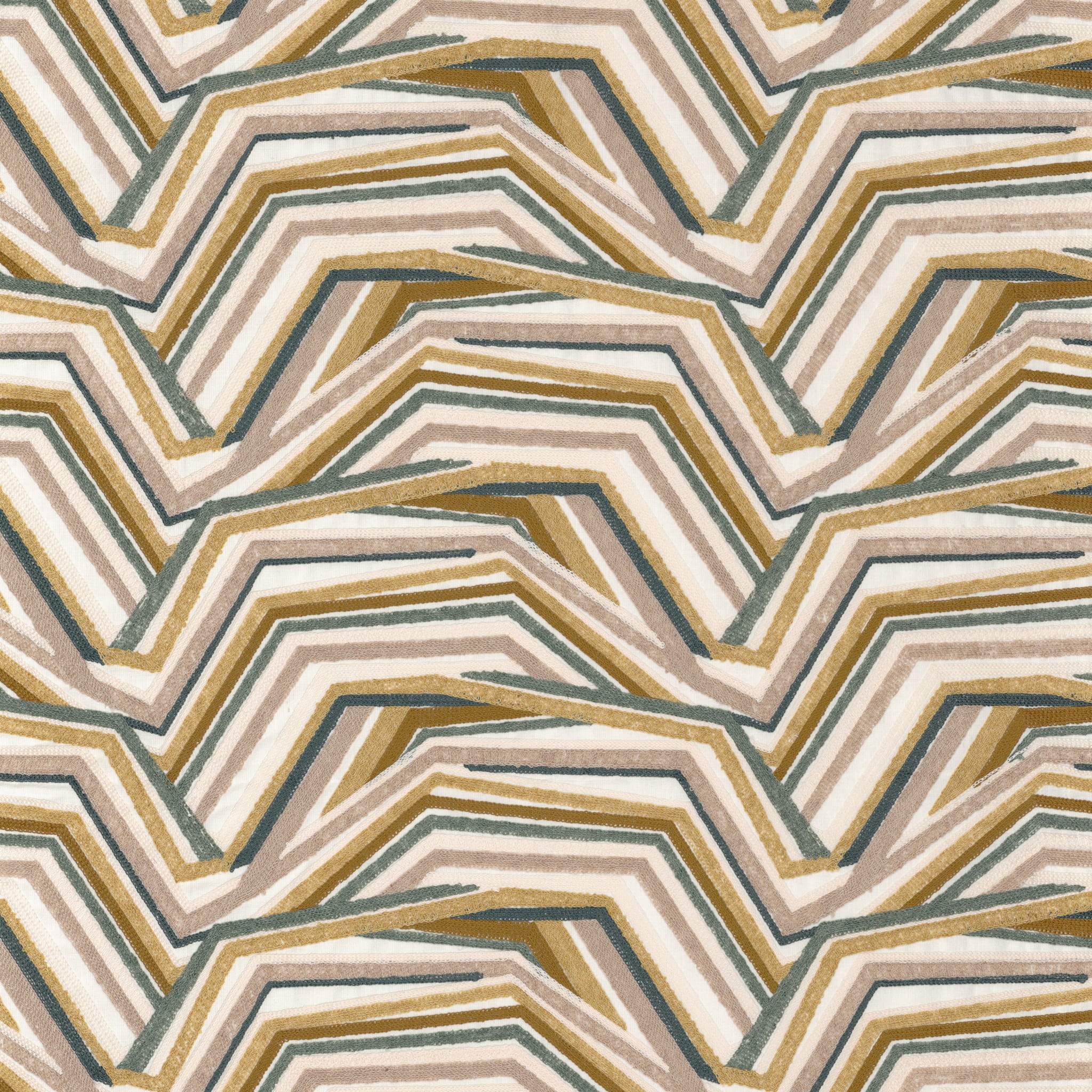 Tkanina Camengo Totem 41370346 Wakan prezentuje abstrakcyjny wzór, który sugeruje odległy krajobraz wydm. Utworzony za pomocą skomplikowanego haftu, którego kolory nakładają się na siebie w doskonałych gradacjach: piaskowy beż, błękit horyzontu, ziemista ochra i glina, a także bardziej designerski czarny, szary i wielbłądzi. Użyta bawełniana przędza jest marled, co nadaje naturalny wygląd, podkreślając miękki wygląd tkaniny.