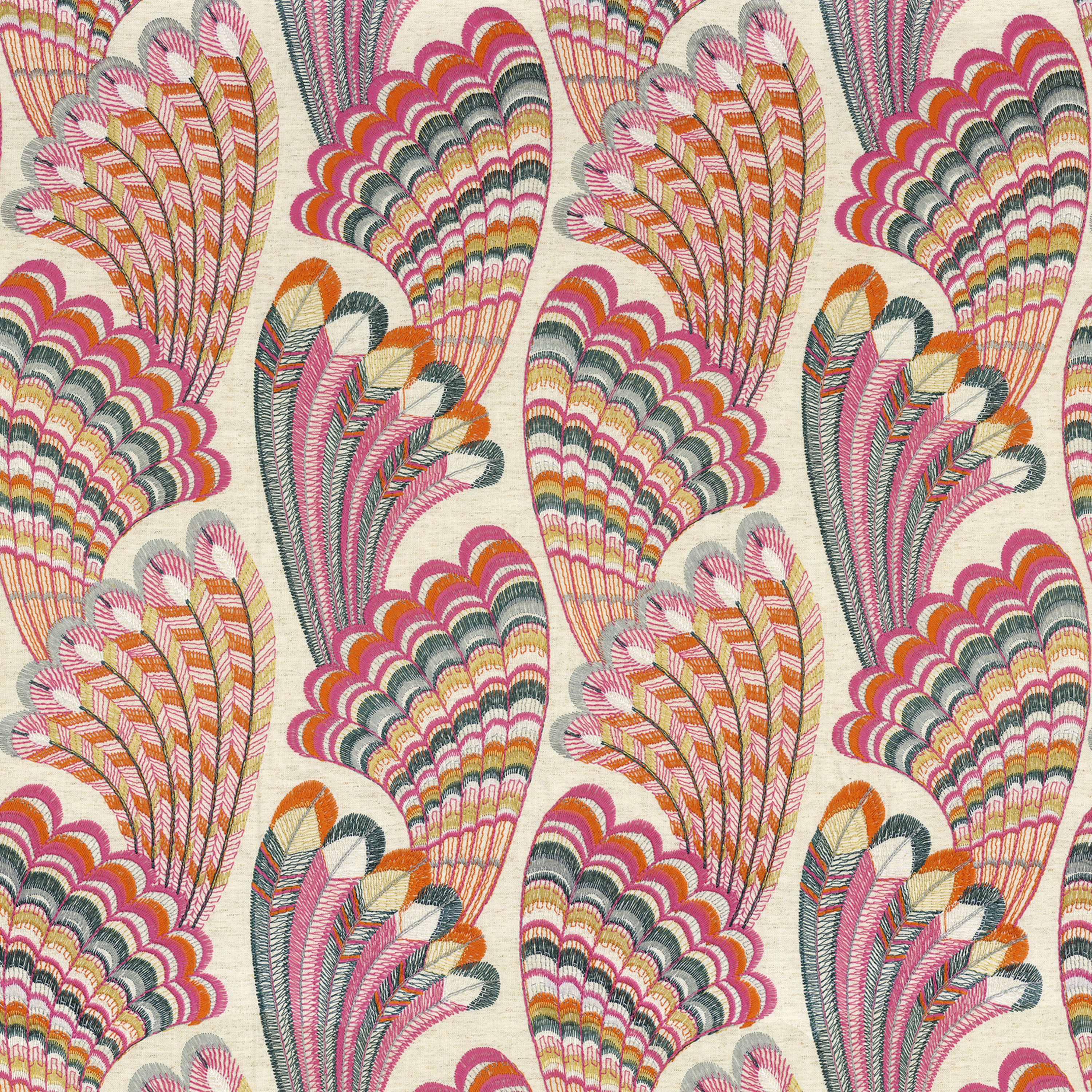 Kolekcja Piuma od Casamance to haftowana tkanina o bogatym wzorze, dostępna w naturalnych, błękitnych i wielobarwnych odcieniach.