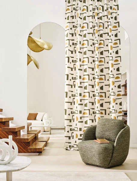 Kolekcja Isotope od Casamance to geometryczna tkanina z haftem i złoconym nadrukiem, pełna kontrastów i teksturalnej głębi.