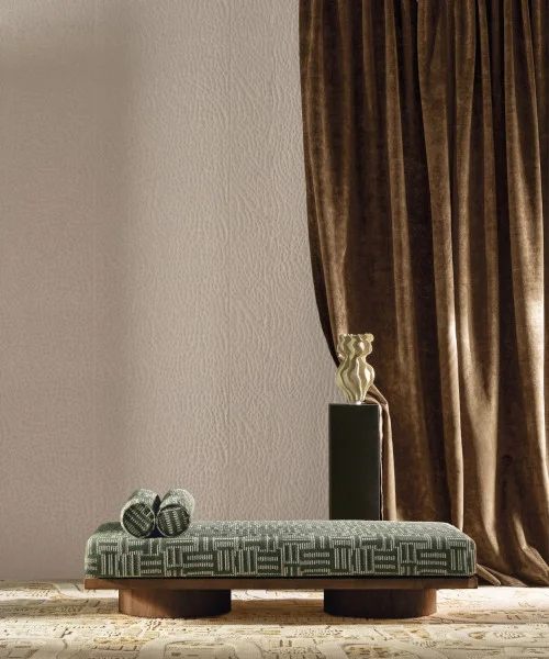 Tkanina Casamance D42480227 Manade 3 to dzianinowy aksamit na płóciennej bazie, ozdobiony mikrowzorem o vintage’owym charakterze. Jego wygląd postarzonej skóry nadaje wnętrzom siłę i miękkość jednocześnie. Kolekcja odważnie wykorzystuje głębokie kolory, podkreślając wolność i indywidualny styl.