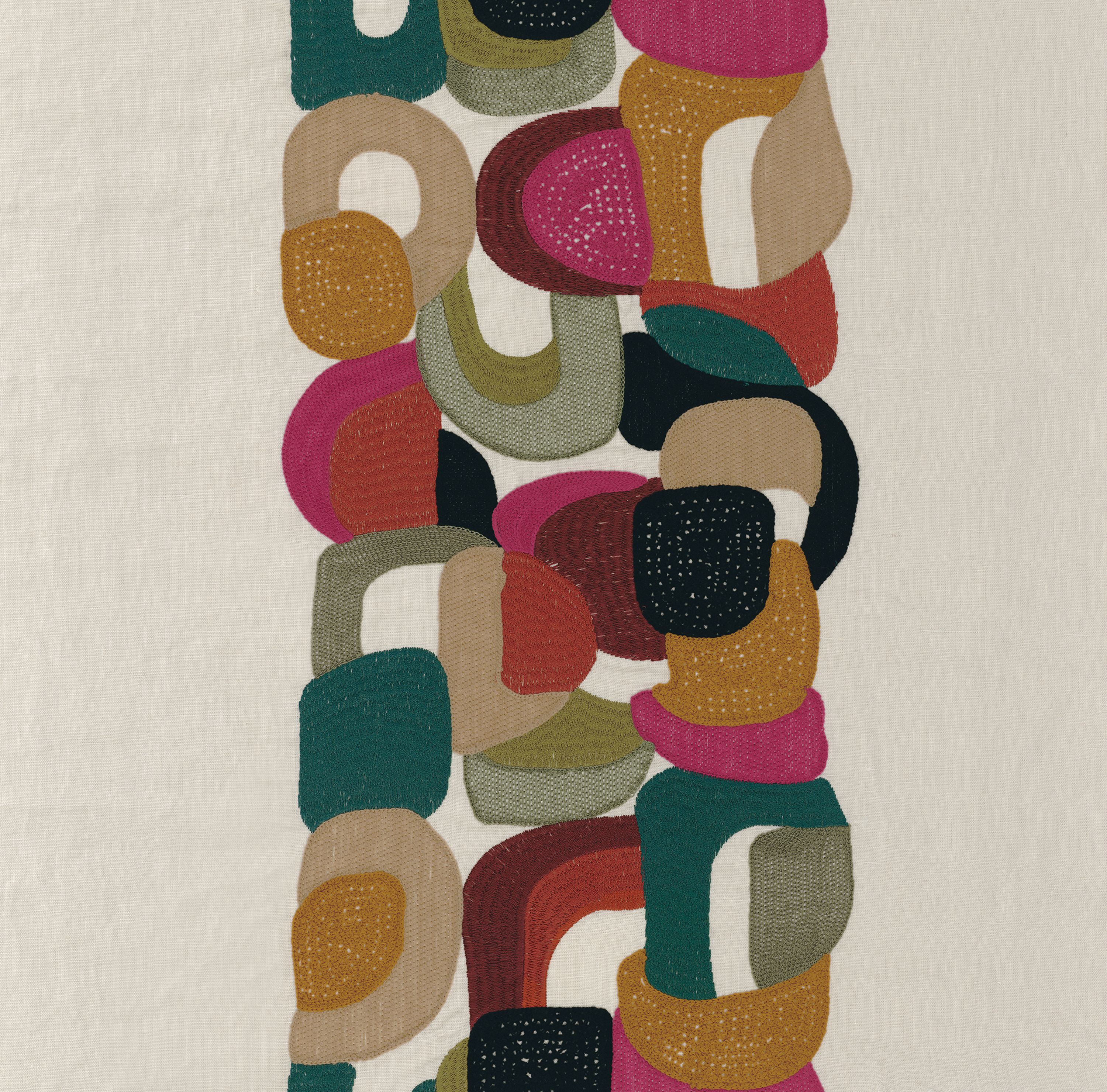 Tkanina Casamance Luminescence 45190311 Convoitise to lniana tkanina, która pokazuje mistrzostwo haftu. Łączy połysk poliestru z matowym wyglądem akrylu, stosując różnorodne ściegi – od płaskich po pętelkowe. Dostępna w trzech wersjach kolorystycznych, podkreśla rzemieślniczy kunszt.