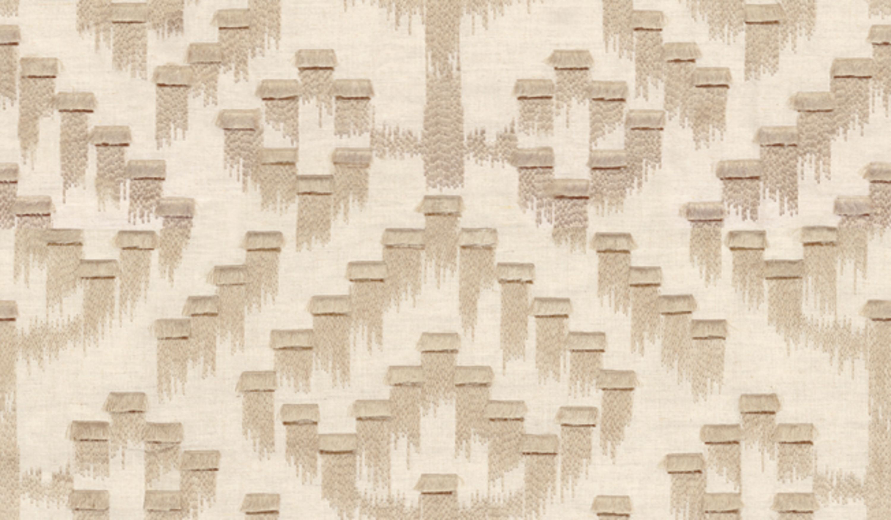 Tkanina Casamance Murmures 10180160 Akame przedstawia piękno japońskich wodospadów, haftowanych na lniano-bawełnianej bazie. Efekt frędzli oddaje ruch spadającej wody. Tkanina dostępna jest w czterech kolorach: beżowym, brązowym, nude i szarym.