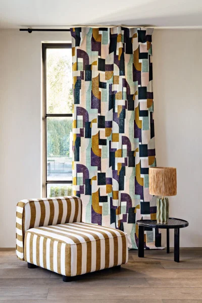 Tkanina Casamance Paris Texas 6 48870456 Batignolles interpretuje styl paryskiej dzielnicy poprzez eleganckie pionowe pasy w sześciu kolorach. Łączy tradycję z nowoczesnością, inspirowaną galeriami sztuki i architekturą Haussmanna. W zestawieniu z Monsouris podkreśla kontrast wzorów i komplementarność odcieni.