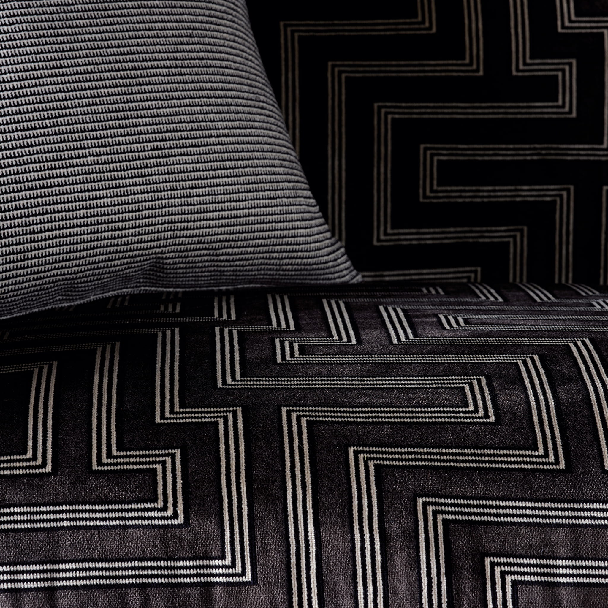 Tkanina Chiaroscuro 01 Horace - Trio komplementarnych tonów tworzy luksusowy wzór labiryntu, który nawigują po nieodpartym aksamicie. Ten wzór jest zarówno elegancki, jak i intrygujący. Idealny do luksusowych wnętrz.