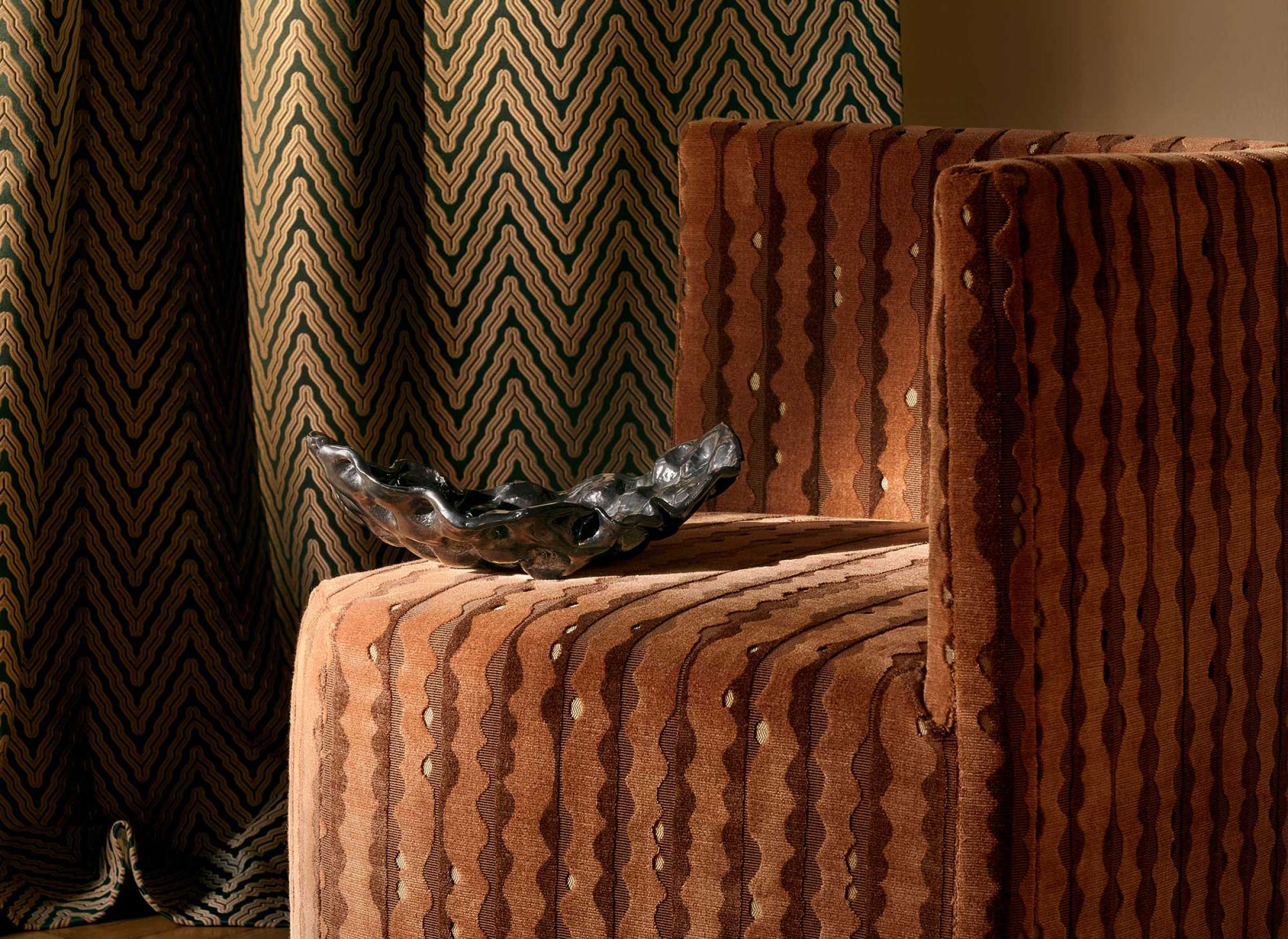 Tkanina Élitis Brera LB 980 12 Orso to kolekcja, która jest zainspirowana stylem Art Deco, welwet z cięcia przypinanego zdobią faliste, pionowe paski, które tworzą dynamiczny wzór. Głębokie, bogate barwy podkreślają luksus i wyrazistość tkaniny. Efekt ten harmonijnie łączy nowoczesność z klasyczną elegancją, tworząc niepowtarzalny wizualny akcent.