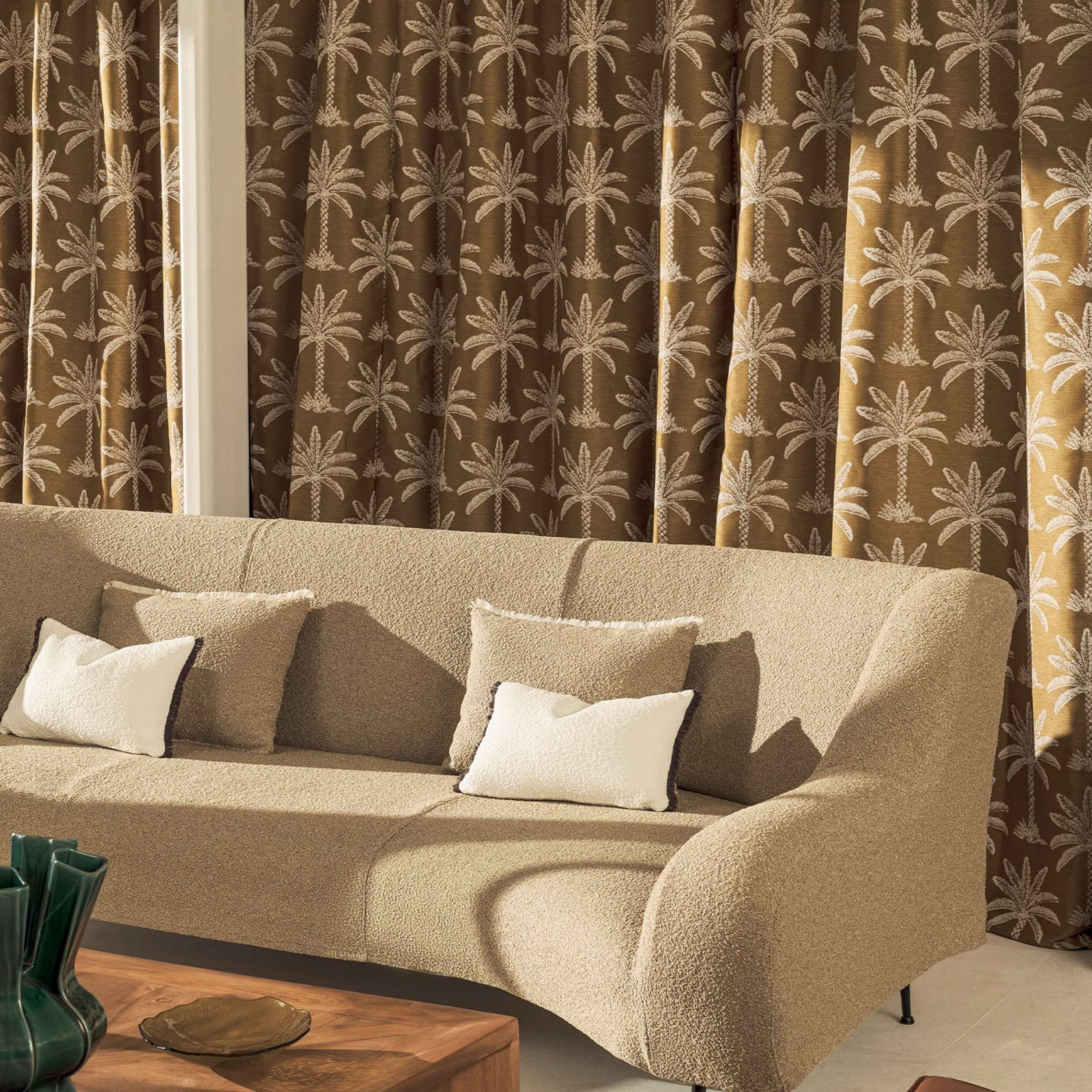 Tkanina Élitis Venice Beach OD 147 22 Los Angeles to tkanina z tropikalnym szykiem, z wzorem żakardowych palm, imituje kreskę ołówkową. Odpowiednia do użycia wewnątrz i na zewnątrz oraz jest trudnopalna. Jej design wprowadza egzotyczny akcent.