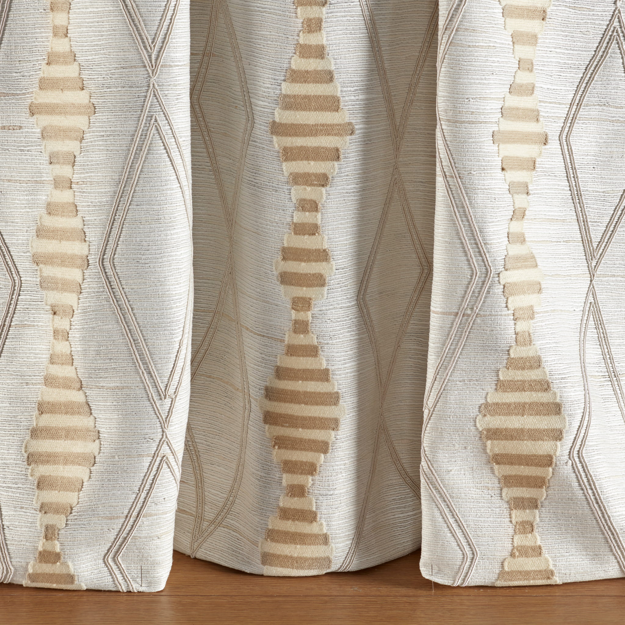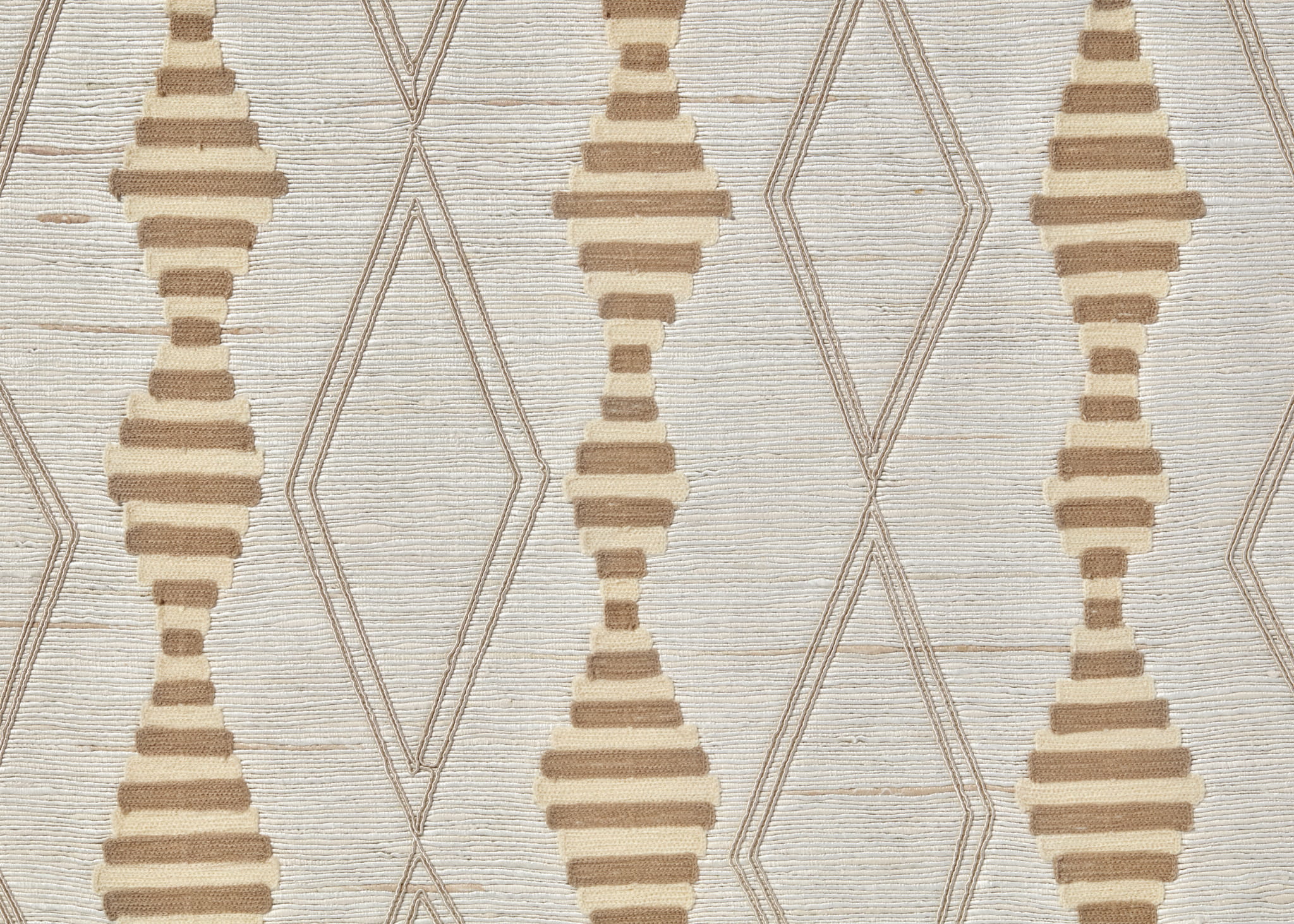 Tkanina Fischbacher 1819 107 Jinpa Diamond to tkanina zasłonowa, haftowana na wykwintnej, ręcznie tkanej i przędzonej mieszance surowego jedwabiu. Materiał charakteryzuje się nieregularną strukturą, a obfite nici wątku tworzą tło dla graficznego haftu diamentowego. Kolekcja dostępna jest w pięciu kolorach, a dla najlepszego efektu zaleca się użycie podszewki.
