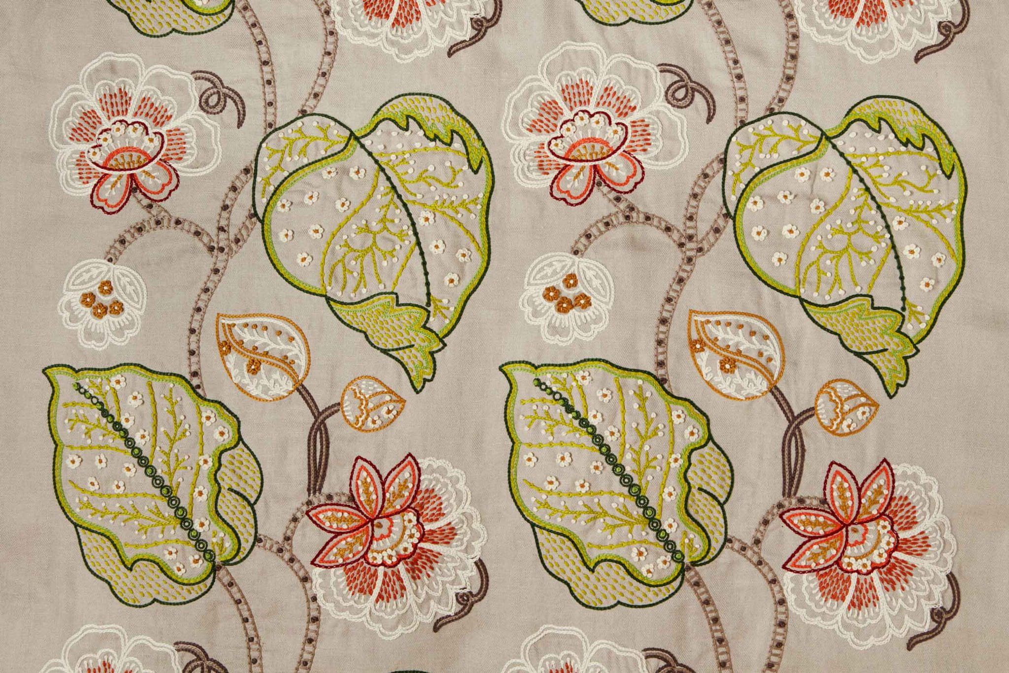 Tkanina Fischbacher 1819 207 Handmade to ręcznie haftowane zasłony, które charakteryzują się efektem ściegu łańcuszkowego i różnymi kombinacjami kolorystycznymi. Kolory bazowej tkaniny obejmują zarówno delikatne, jak i intensywne odcienie, a haftowane motywy kwiatowe dodają romantyzmu. Tkanina bazowa wykonana jest w 100% z lnu, łącząc tradycję z nowoczesnym stylem.