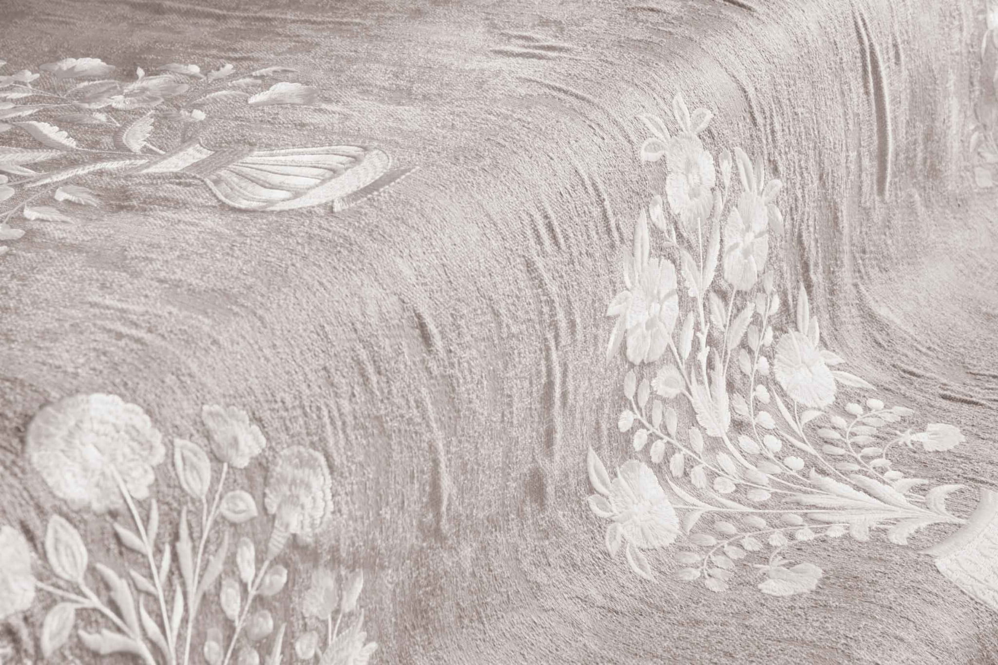 Tkanina Fischbacher 1819 405 Epoque to haft kwiatowy na ciężkiej tkaninie żakardowej z wzorem patyny, dostępna w mieszance bawełny i lnu. Haft w odcieniach bieli dostępny jest na tkaninie w kolorze gołębim szarym, naturalnym lnie i kremowym. Tkanina ta nadaje się zarówno na zasłony, jak i do lekkiej tapicerki, łącząc klasyczny urok z nowoczesną elegancją.