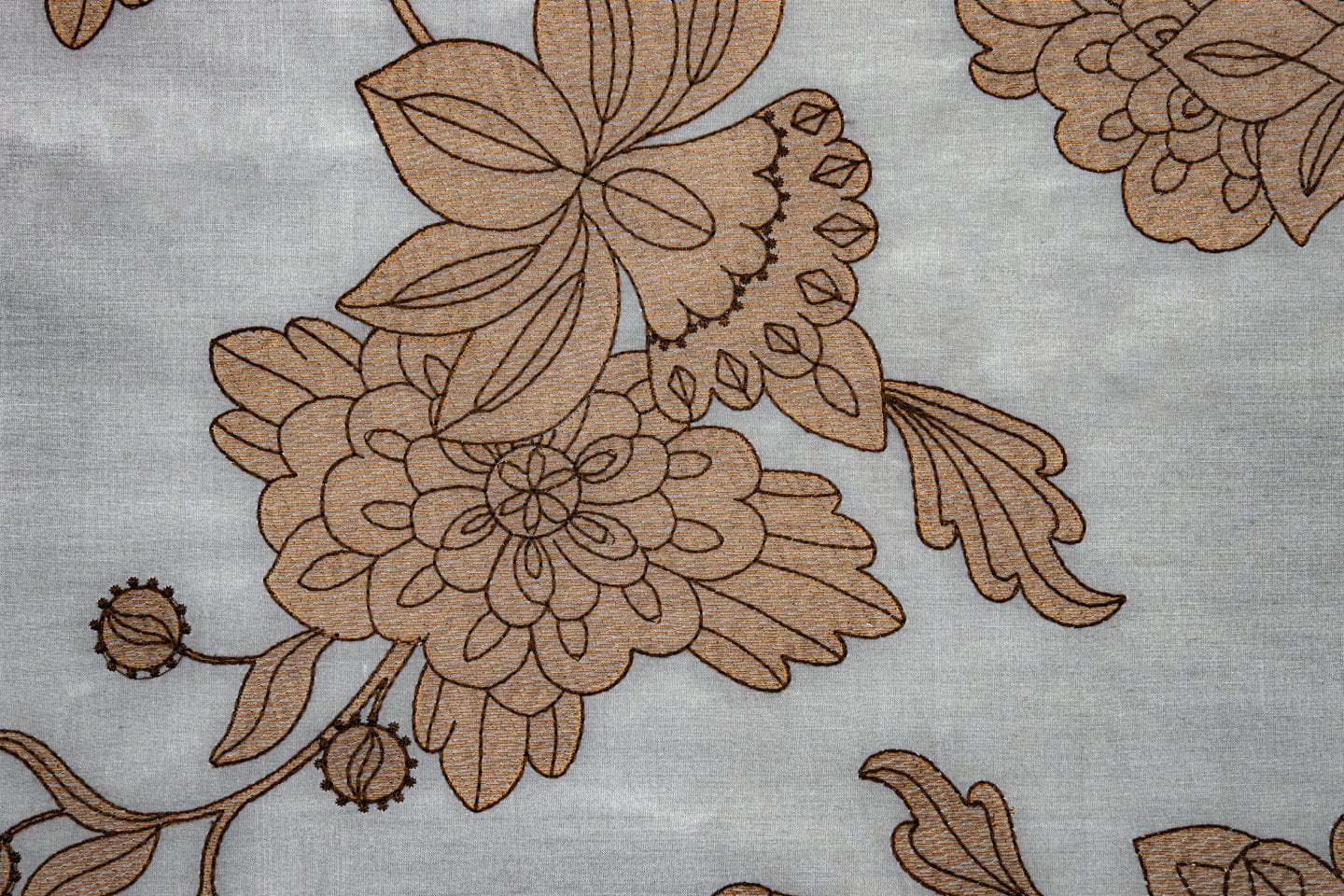 Tkanina Fischbacher 1819 417 Leora łączy tradycyjną perską sztukę z nowoczesnym wzornictwem, przekształcając wzory w monochromatyczne rysunki na bawełniano-jedwabnej tkaninie. Ta unikalna tkanina wyróżnia się subtelnym blaskiem, będącym efektem użycia cennych materiałów. Wzory są pieczołowicie wyszywane, co dodaje tkaninie elegancji i ponadczasowości.