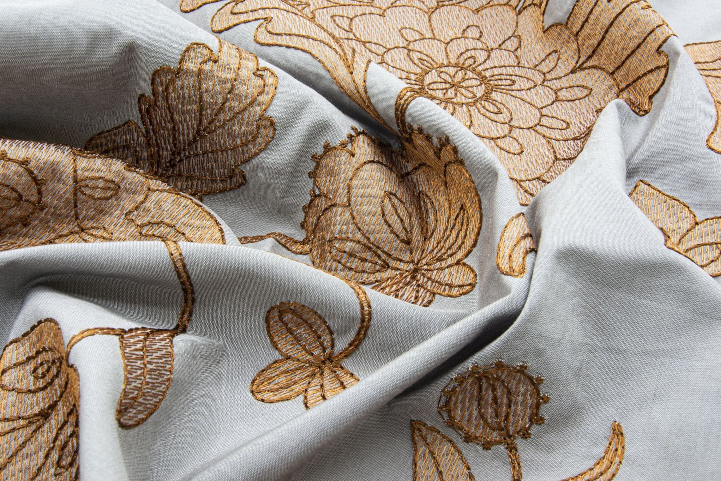 Kolekcja Leora od Fischbacher 1819 to tkanina inspirowana perską sztuką tekstylną, z monochromatycznym wzorem wyszywanym na bawełniano-jedwabnej bazie. Subtelny blask dzięki mieszance cennych materiałów.
