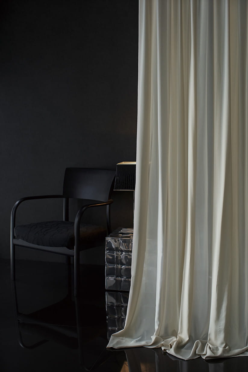 Kolekcja Anna od Fischbacher 1819 z grubymi paskami jest wykonana z Trevira CS i charakteryzuje się kaskadową strukturą. Naprzemienne gęsto tkane i przezroczyste sekcje tworzą prosty, lecz wyrafinowany wzór. Dostępna w dziesięciu kolorach.