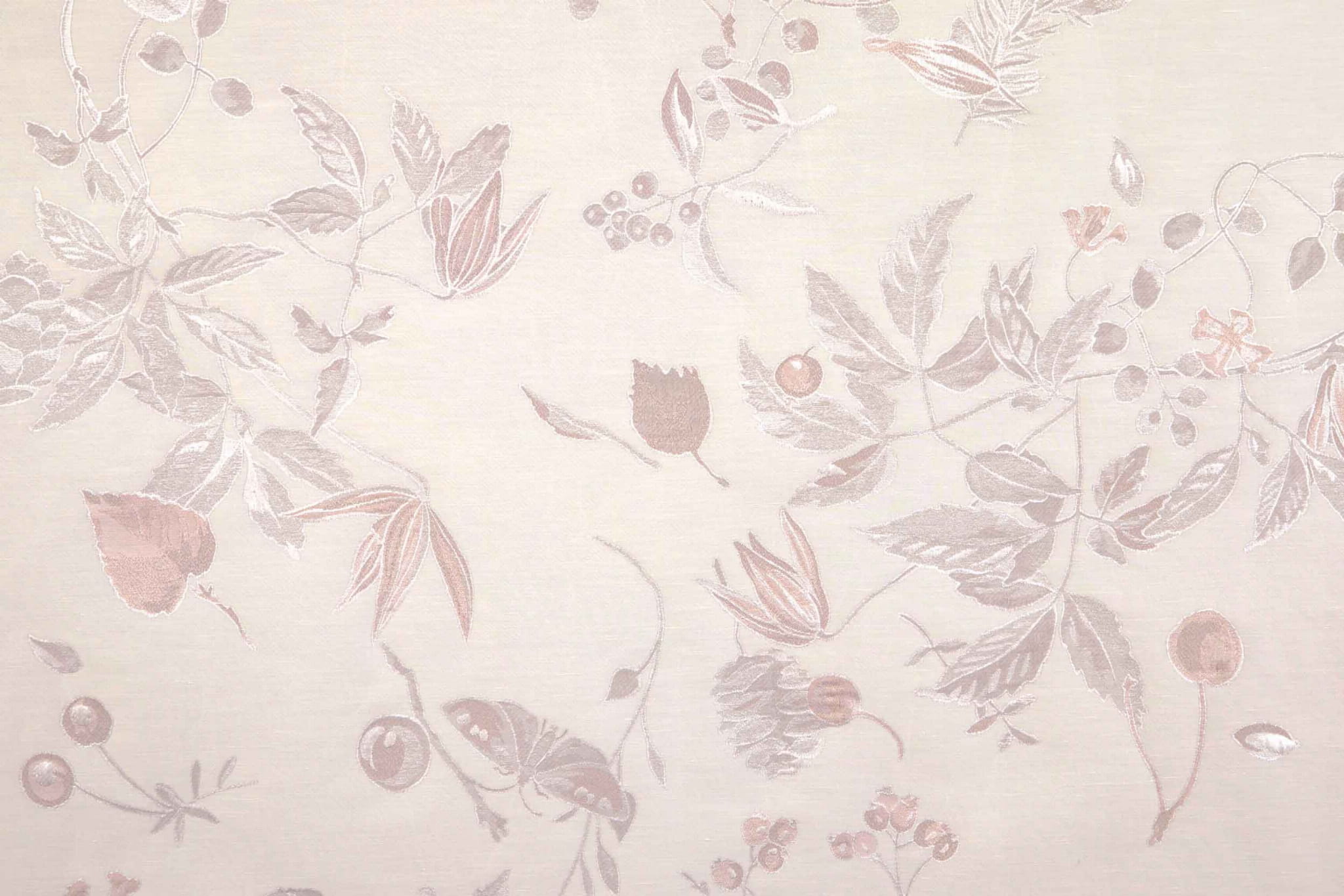 Tkanina Fischbacher 1819 505 Dorato to żakardowa tkanina zasłonowa, czerpiąca inspirację z bogactwa natury. Kwiaty i liście wędrują po tkaninie, tworząc lśniący efekt dzięki delikatnym konturom z przędzy lurex, które kontrastują z matowym lnianym tłem. Specjalne wykończenie zapewnia tkaninie wyjątkową miękkość i doskonałe ułożenie. Dorato jest dostępne w trzech wariantach kolorystycznych: delikatna biel i róża, złoto i niebieski oraz bogata czerń i miedź.