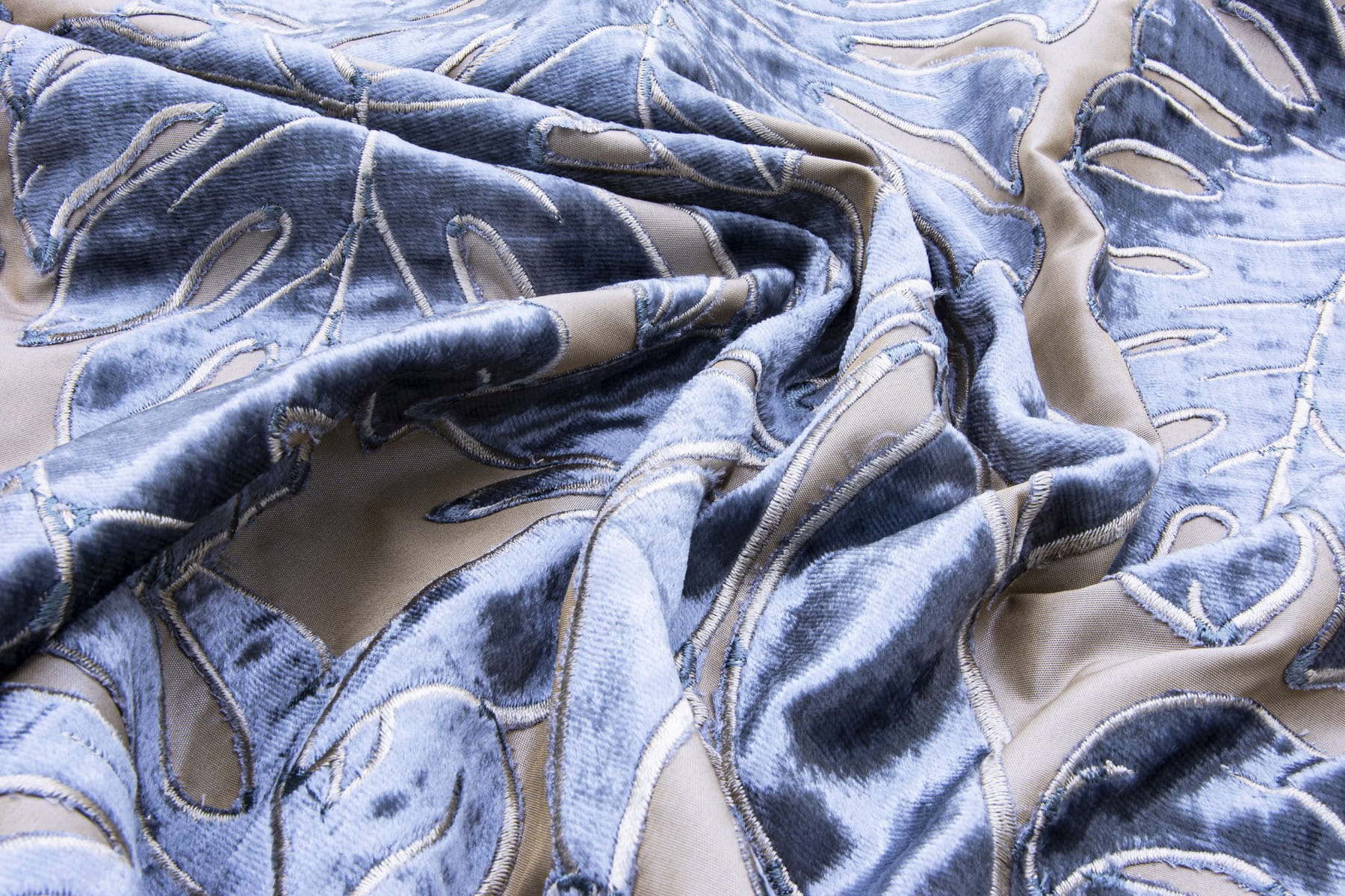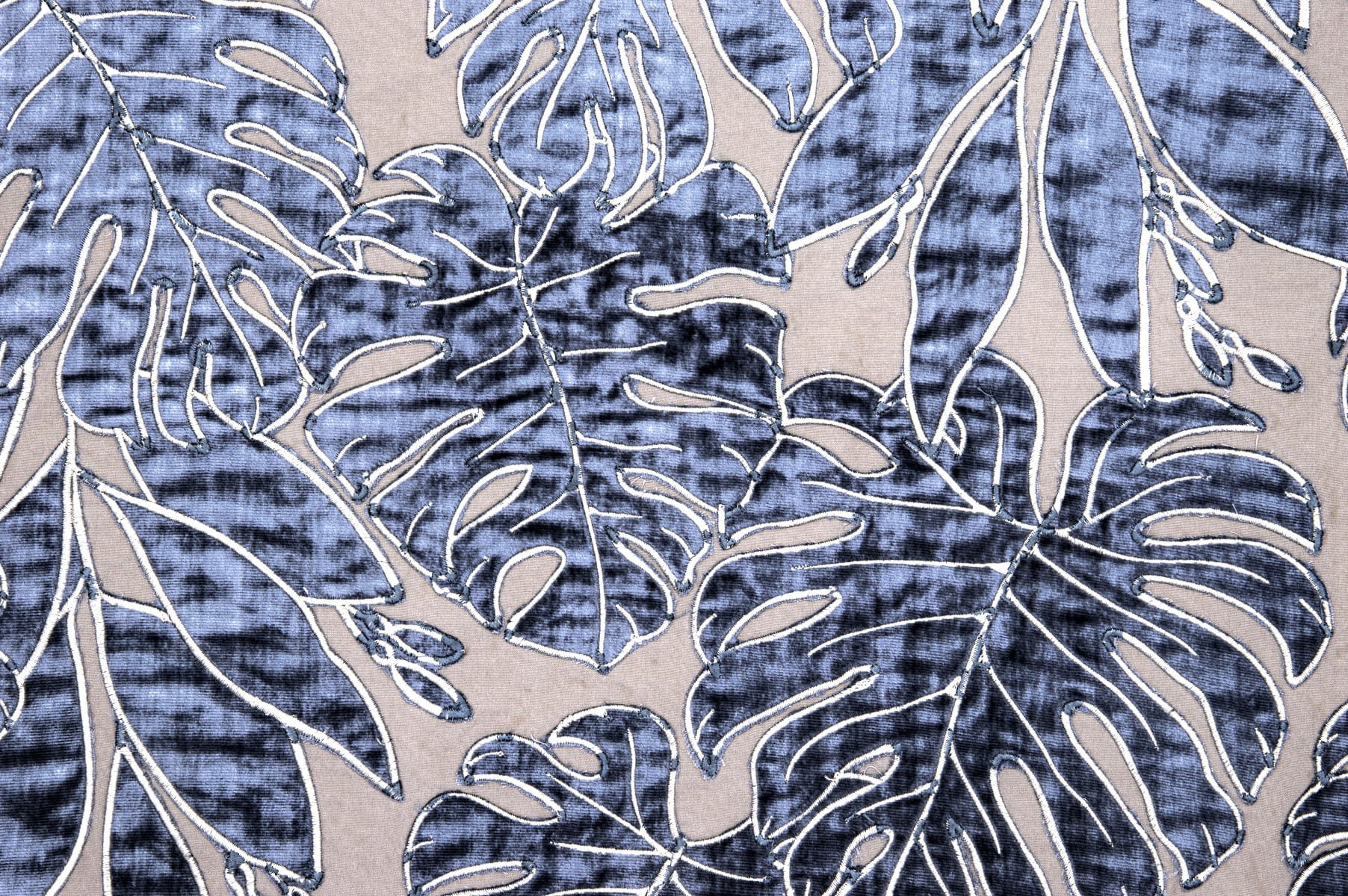Tkanina Fischbacher 1819 505 Selva to tropikalny las deszczowy na Twoich oknach, z aksamitnymi liśćmi ręcznie aplikowanymi na poliestrowej taftowej tkaninie. Blask aksamitu i dwukolorowe hafty nadają Selva żywy i elegancki wygląd, który w zależności od koloru może być elegancko bogaty lub intensywnie tropikalny.