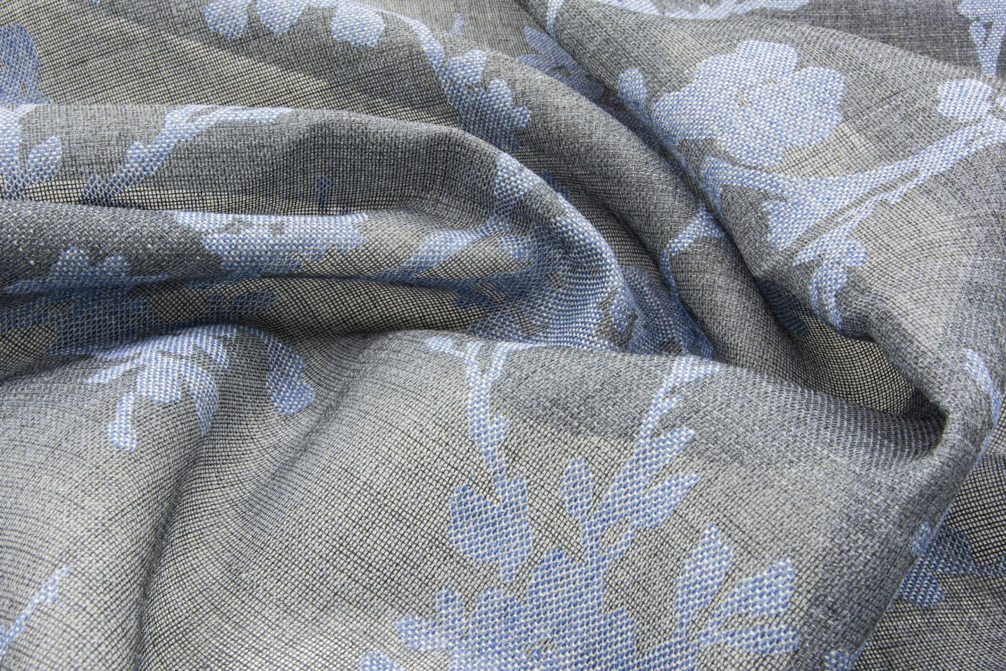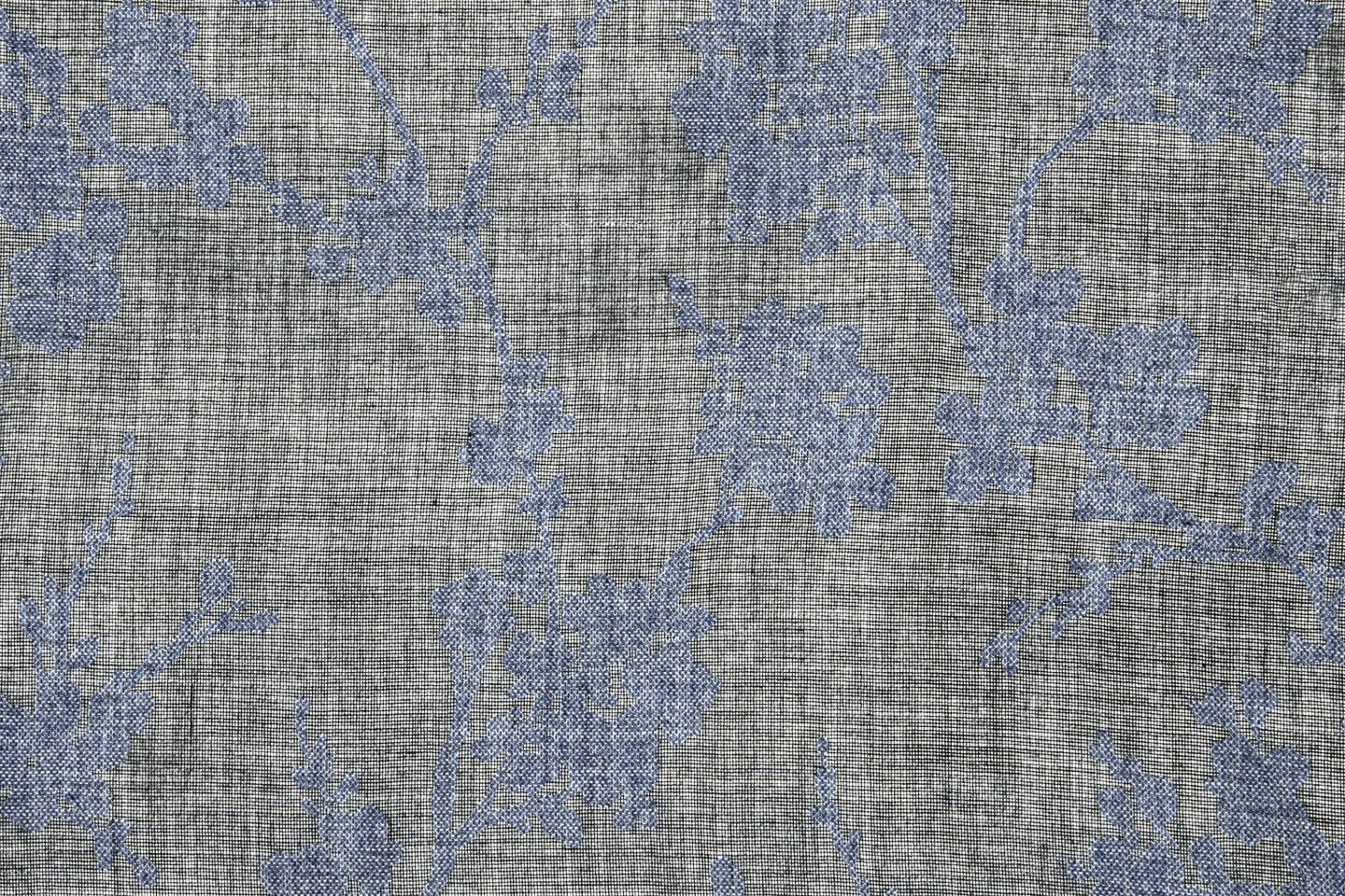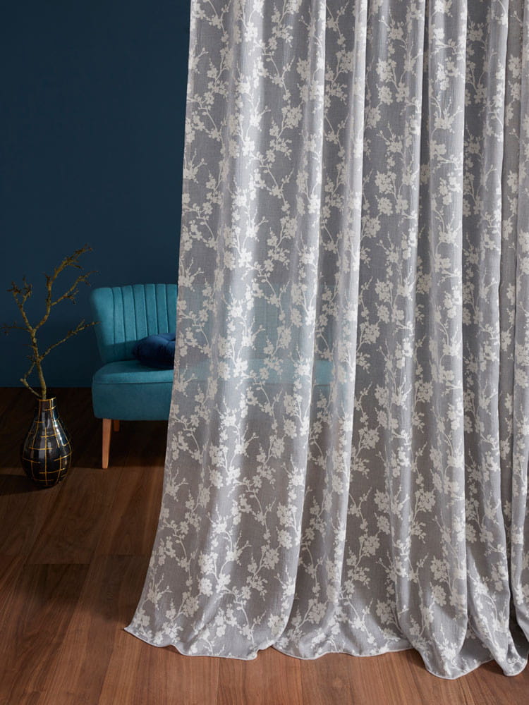 Kolekcja Priti od Fischbacher 1819 to tkanina z mieszanki bawełny i poliestru, z półprzezroczystym tłem i kwiatowym wzorem. Miękkie drapowanie, dostępne w naturalnych odcieniach, dżinsowym niebieskim i antracycie.