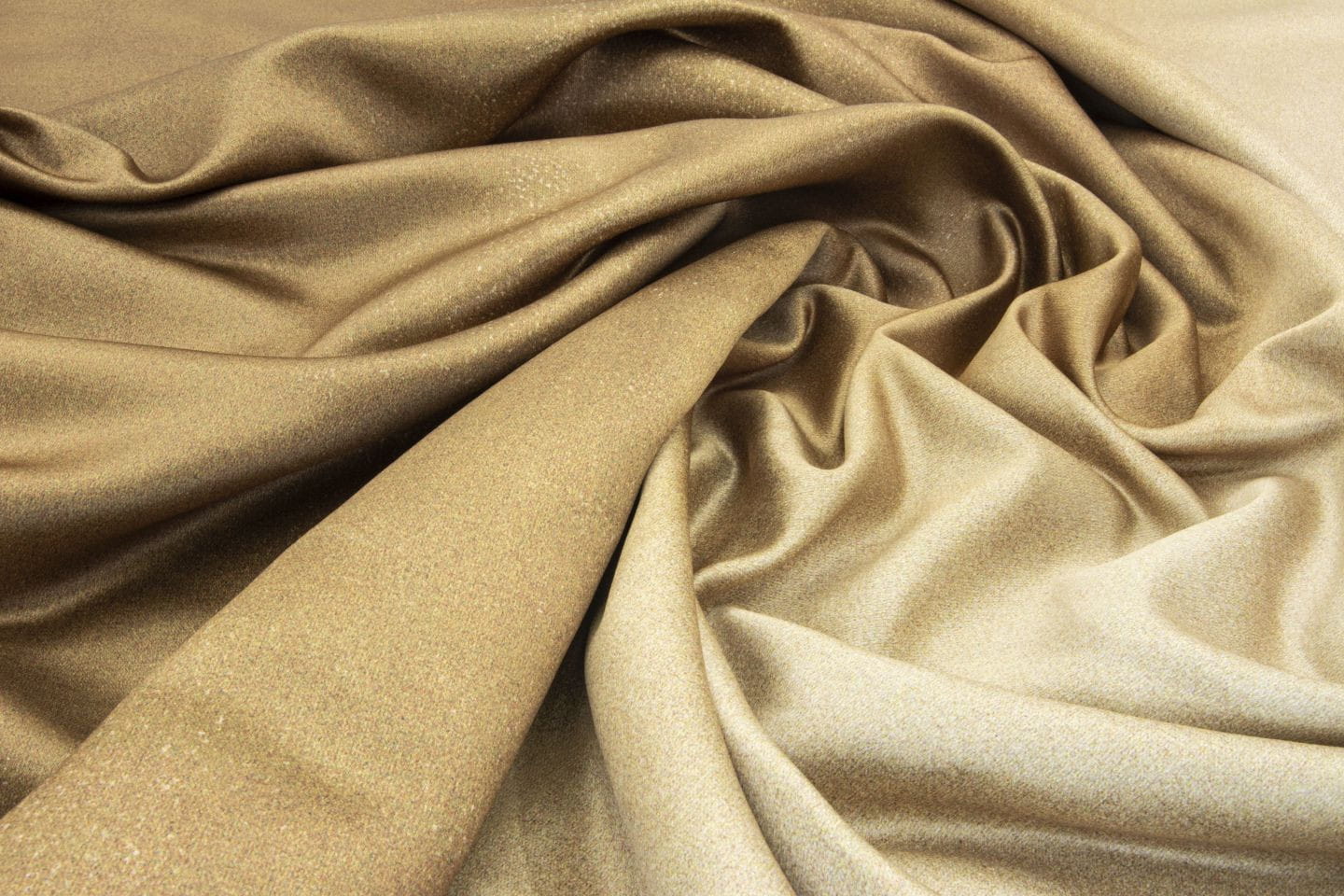Tkanina Fischbacher 1819 703 On The Beach to kolekcja tkanin, która naśladuje sposób, w jaki światło odbija się od połyskującego morza. Intensywna barwa u dołu tkaniny stopniowo blednie ku górze, tworząc subtelne przejścia. Druk cyfrowy na satynie, dostępny w kolorach złotym i ciemnozielonym, nadaje tkaninom elegancki wygląd.