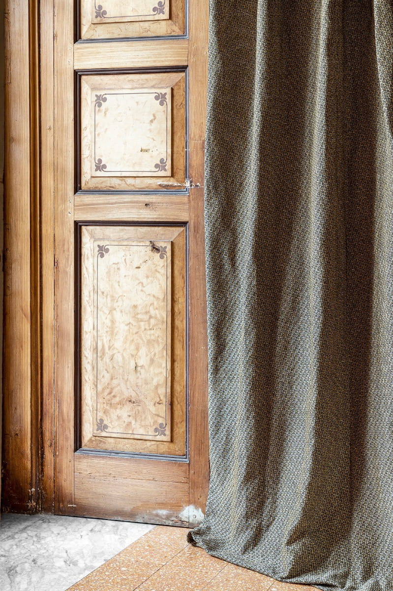 Tkanina Fischbacher 1819 707 Labyrinth to zasłona jacquardowa wykonana z miękkiej mieszanki wełny, z małym, graficznym wzorem przypominającym tajemniczy labirynt. Kolekcja dostępna jest w palecie kolorów od naturalnych odcieni po nowoczesne niebieski i szafranowy żółty. Dzięki LABYRINTH wprowadzisz do swojego wnętrza zarówno elegancję, jak i nowoczesny styl.