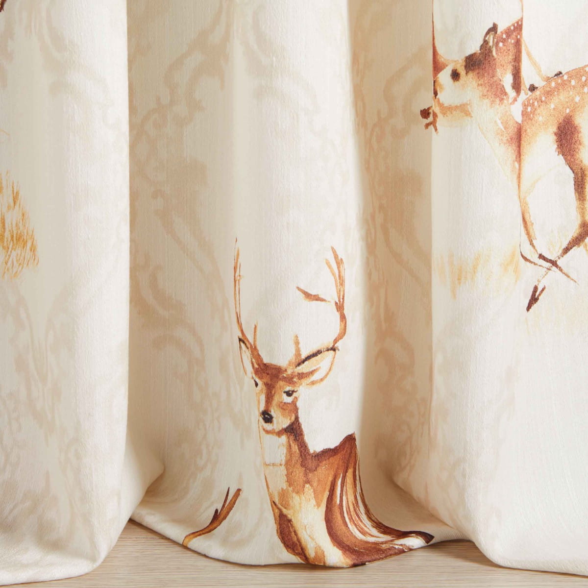 Kolekcja Alpina od Fischbacher 1819 to cyfrowy nadruk na szerokiej tkaninie żakardowej Trevira CS, z naturalnym wyglądem dzięki różnym grubościom przędz. Motyw jelenia w akwareli jest ręcznie malowany. Możliwość łączenia z jednolitą tkaniną Anahita.