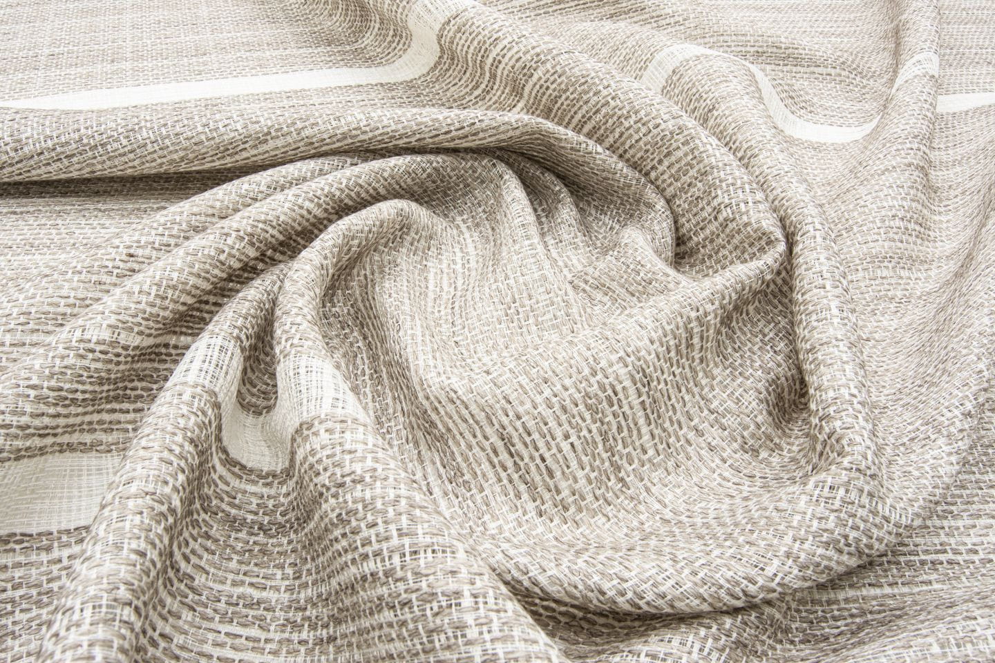 Kolekcja Templo Mayor od Fischbacher 1819 to tkanina dekoracyjna o melanżowym wyglądzie, z wąskimi paskami, dostępna w naturalnych kolorach oraz czystej bieli.