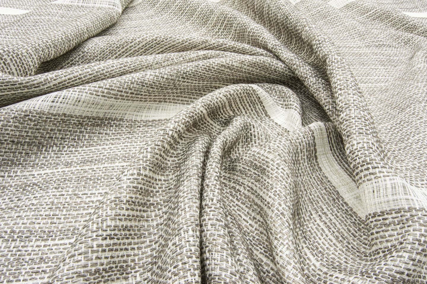 Tkanina Fischbacher 1819 917 Templo Mayor to tkanina dekoracyjna z melanżowym wyglądem i wąskimi paskami, którą można układać zarówno w kierunku osnowy, jak i wątku. Nieregularne nitki osnowy są widoczne w przezroczystych punktach pasków, a biała osnowa łączy się z kolorami natury, takimi jak beż, jasny szary i antracyt. Kolekcja dostępna jest również w czystej bieli.