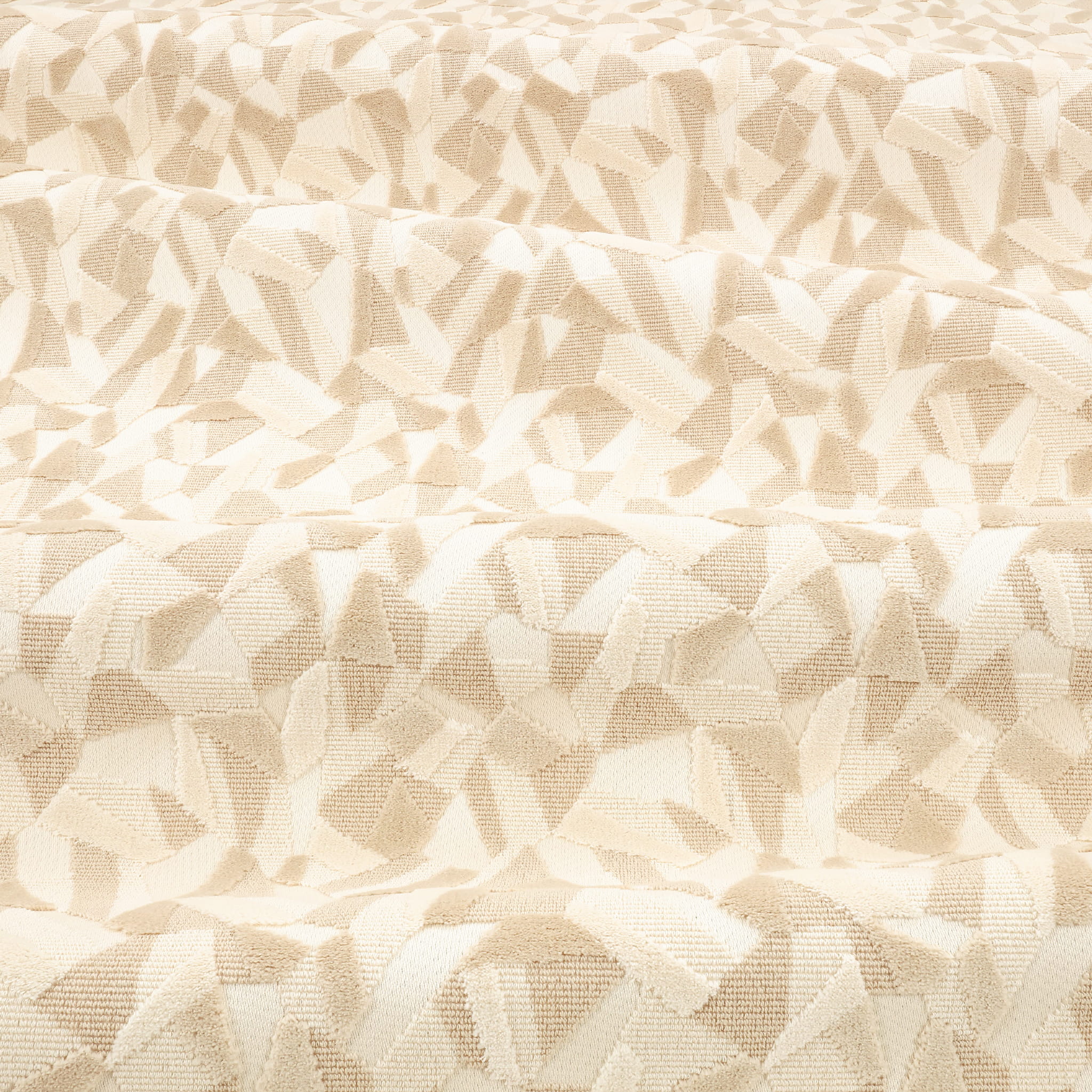 Tkanina Graphic Nature 01 Aerial - Zrównoważony cięty i niecięty welur do wnętrz, tkany z 63% recyklingowanej bawełny. Graficzny wzór inspirowany widokami pól uprawnych z lotu ptaka. Kształty ząbkowane w połączeniu różnych tekstur łączą się w jeden wyrazisty wzór.