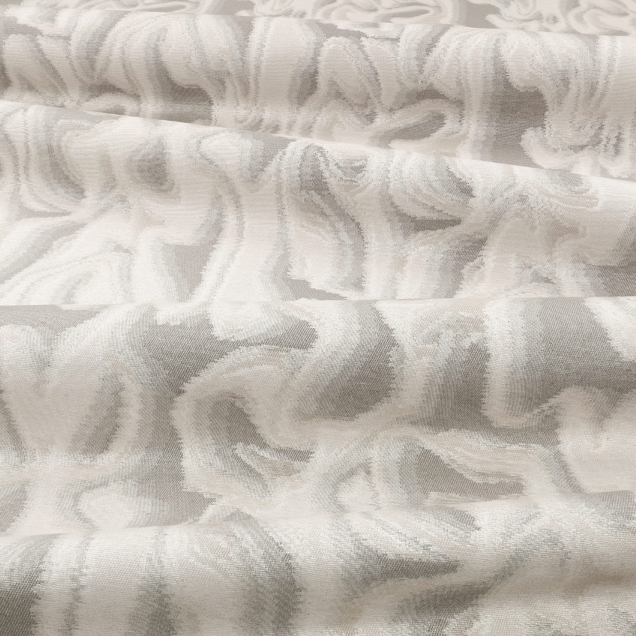 Tkanina Graphic Nature 02 Glint jest tkana z bawełny i etycznie produkowanego jedwabiu, znanego jako jedwab Ahimsa (ERI). Jest on przędzeny z pustych kokonów pozostawionych przez jedwabniki po wykluciu się, co jest uważane za bardziej etyczną metodę produkcji jedwabiu. Kontrastujący wygląd matowych i lśniących przędzy nadaje wzorowi poczucie głębi i ruchu.