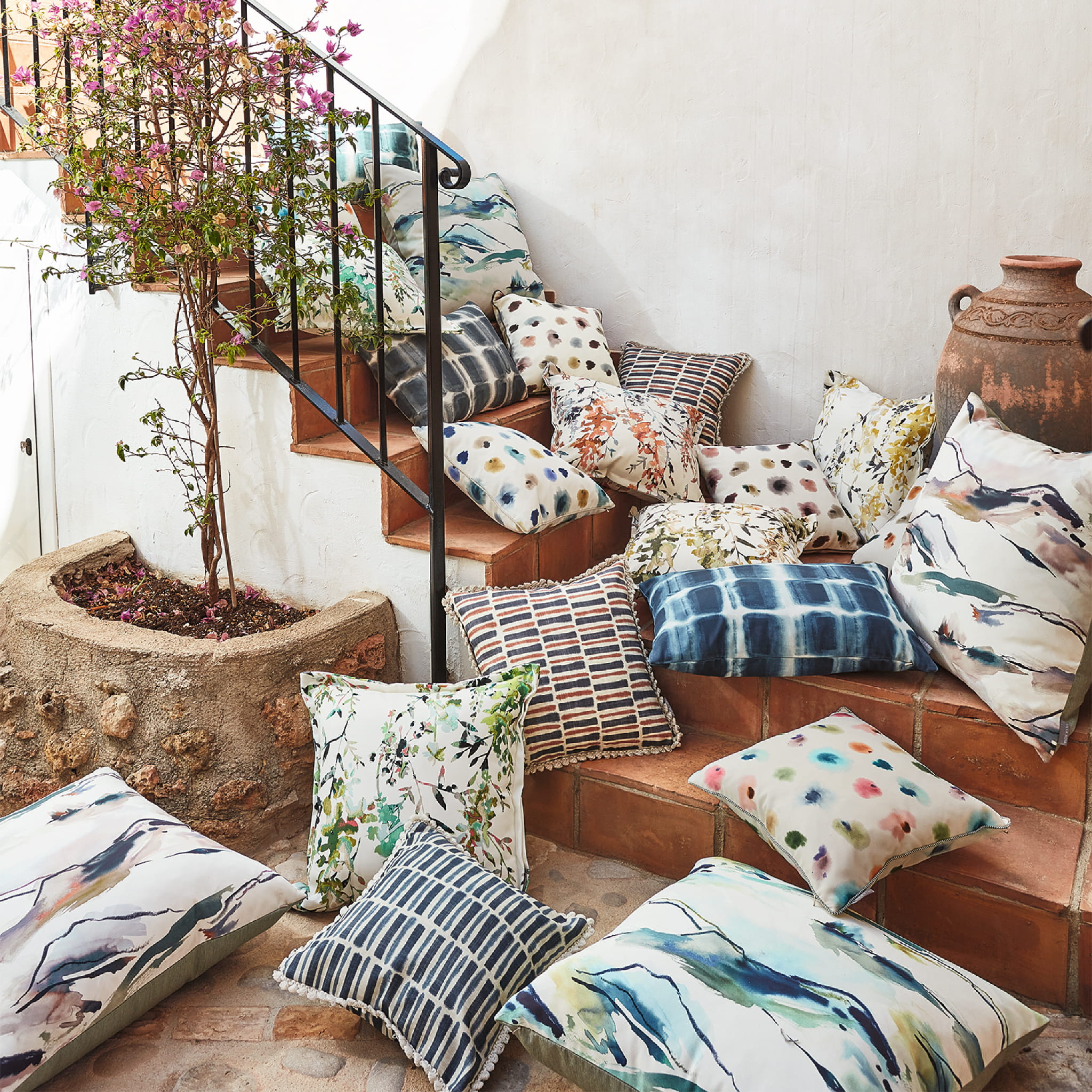Tkanina Horto Outdoor 01 Samui - Nieskończona eksploracja krajobrazów, Samui przywołuje czarujące wybrzeże. Cyfrowo drukowana, aby uchwycić oryginalny, ręcznie malowany charakter, ta tkanina odpowiednia do użytku na zewnątrz jest zarówno praktyczna, jak i piękna. Doskonała do tworzenia inspirujących, naturalnych przestrzeni.