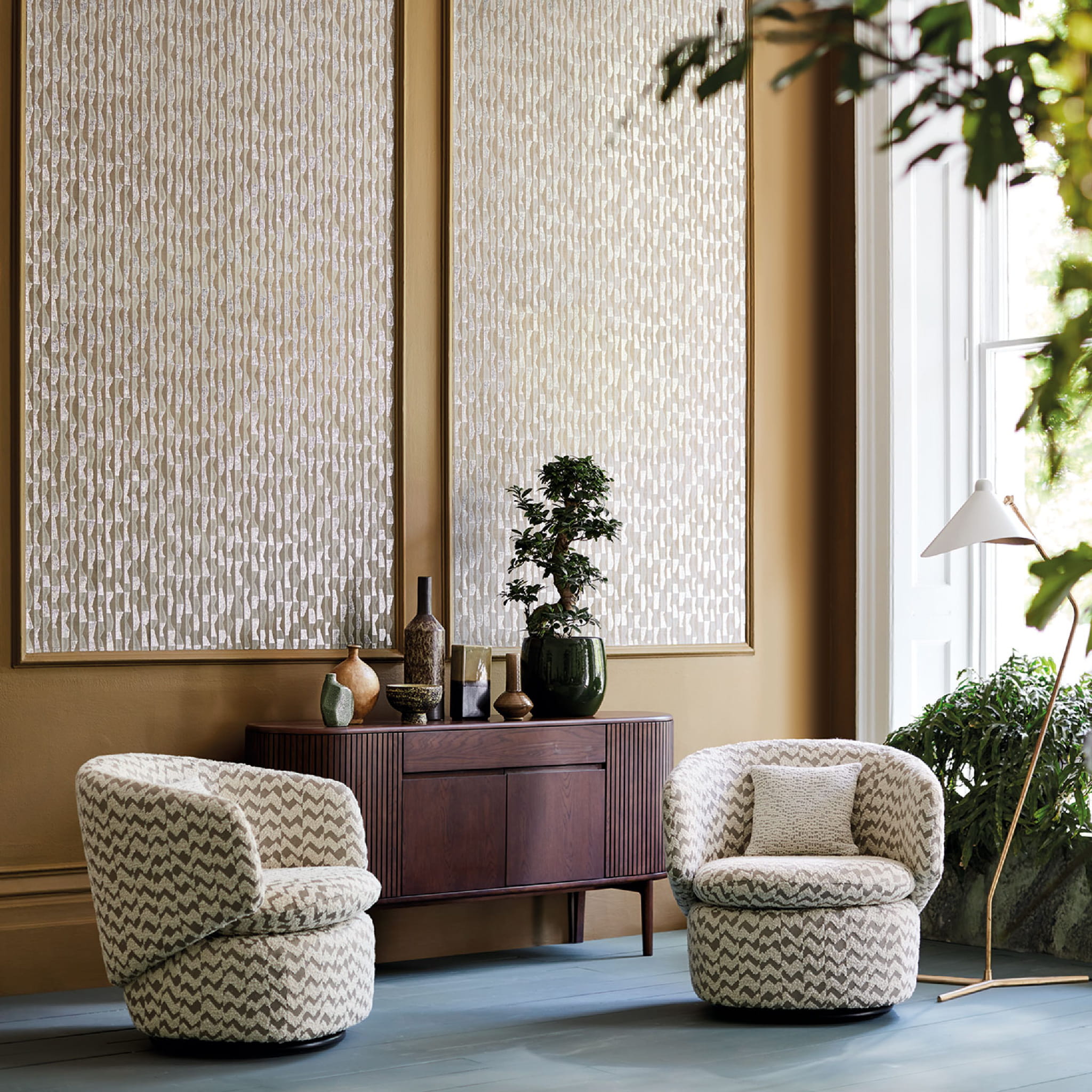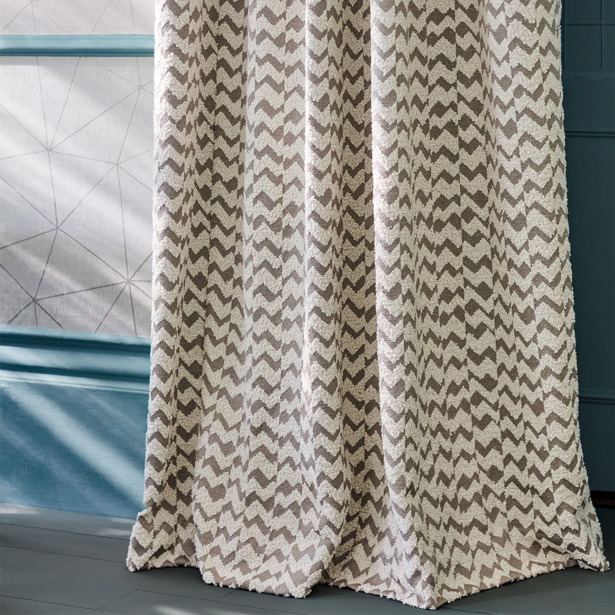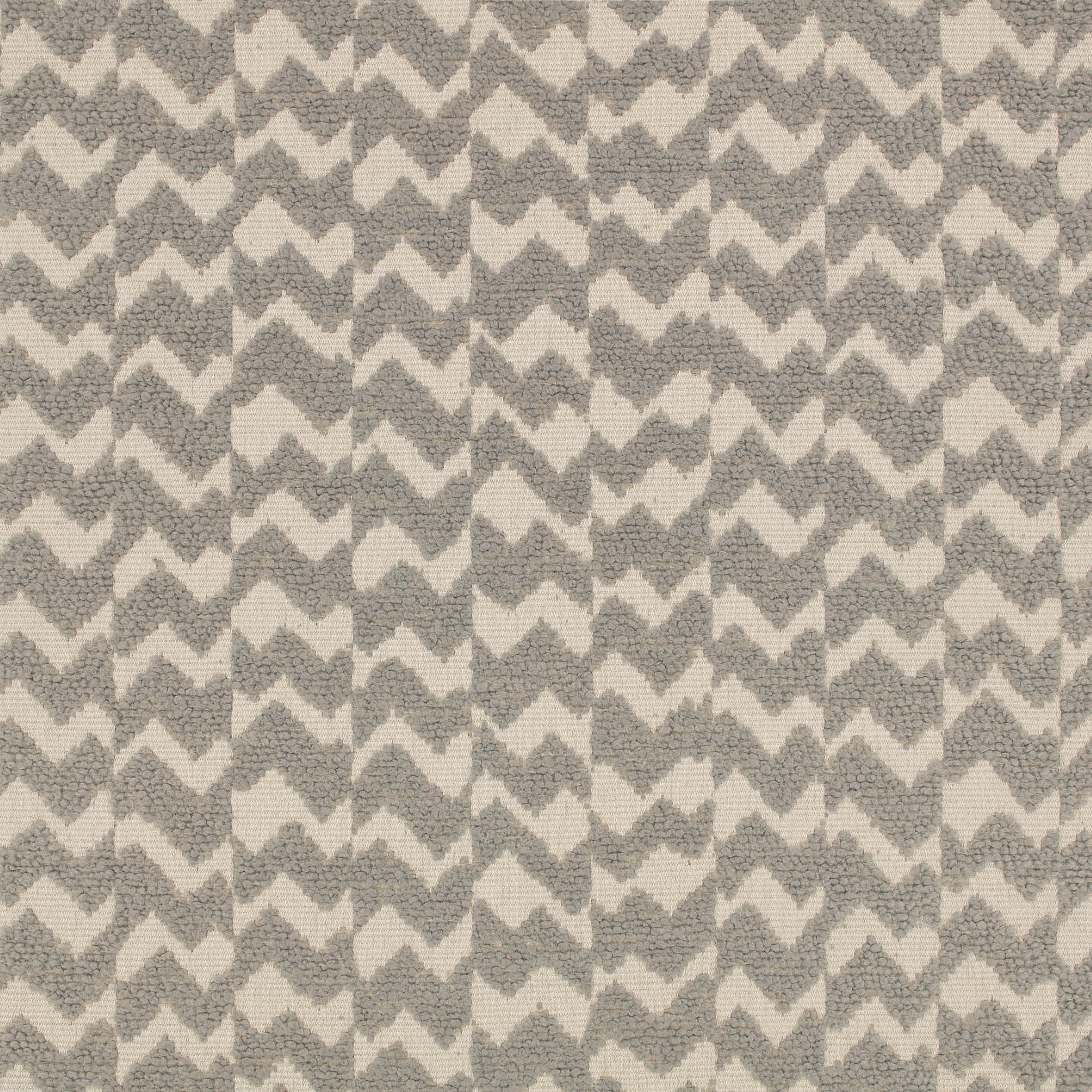 Tkanina Muoto 01 Samar to tkanina o organicznym wyglądzie i fakturze. Nieregularny, stopniowany chevron z bouclé znajduje się na delikatnie żebrowanym tle, które jest lekko podkreślone metalicznym połyskiem.