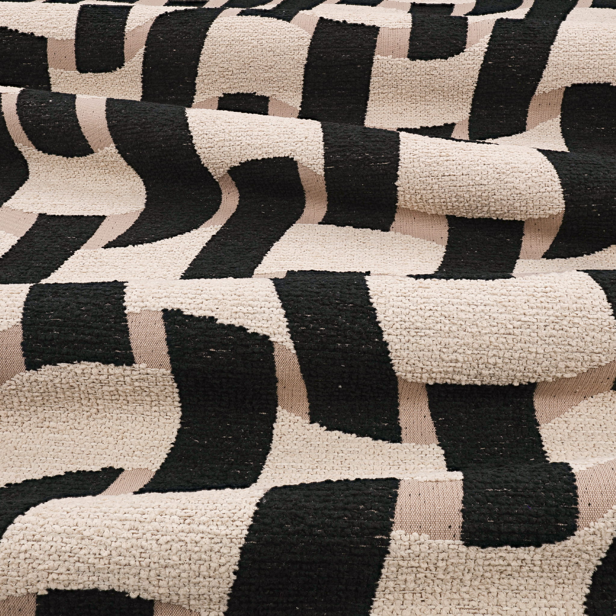 Tkanina Tide Outdoor Recycled 01 Pool to śmiałe i graficzne wzornictwo, które przypomina falujące linie i krzywe, tworząc efekt regularnego wzoru płytek zniekształconego przez wodę w basenie. Całkowity efekt tego wzoru to płynność i ruch, jakby woda stale poruszała się po powierzchni tkaniny. Bouclé o wyraźnej fakturze wyróżnia się na neutralnym tle, tworząc harmonijne połączenie kolorów.