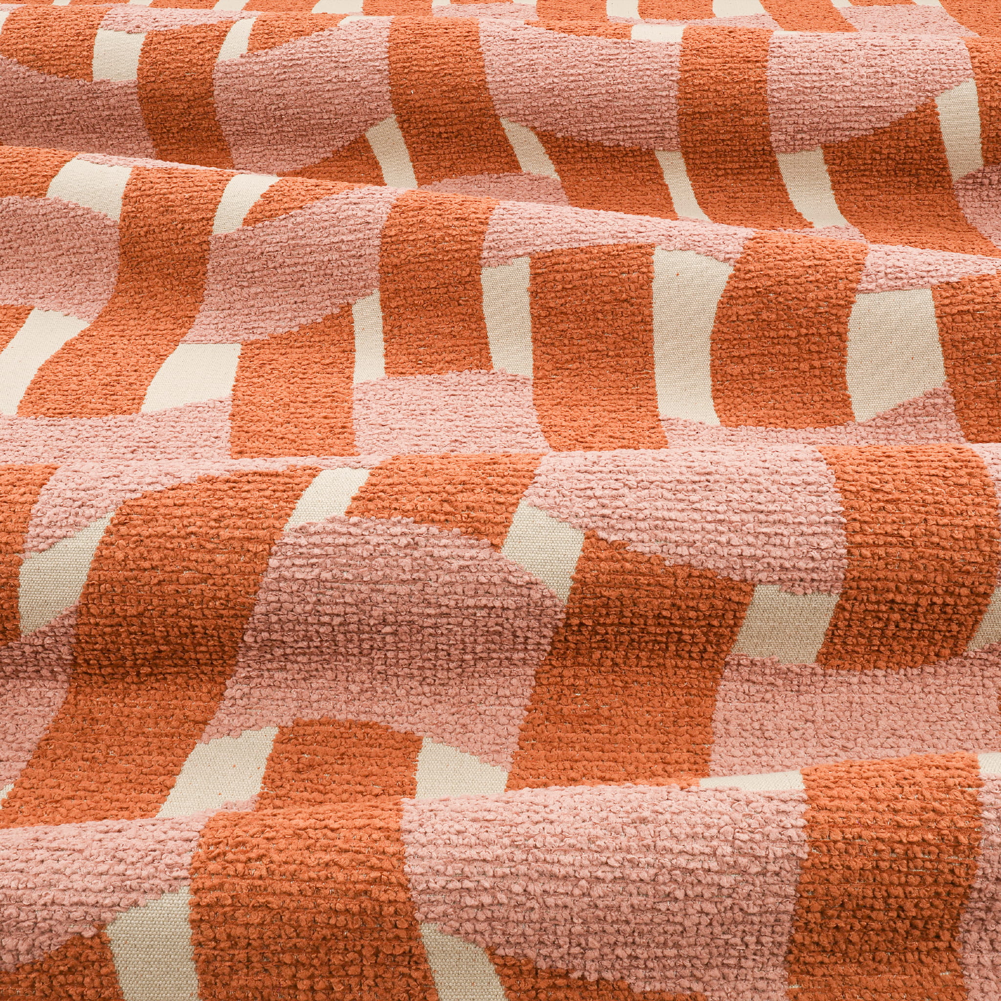 Tkanina Tide Outdoor Recycled 02 Pool to śmiałe i graficzne wzornictwo, które przypomina falujące linie i krzywe, tworząc efekt regularnego wzoru płytek zniekształconego przez wodę w basenie. Całkowity efekt tego wzoru to płynność i ruch, jakby woda stale poruszała się po powierzchni tkaniny. Bouclé o wyraźnej fakturze wyróżnia się na neutralnym tle, tworząc harmonijne połączenie kolorów.