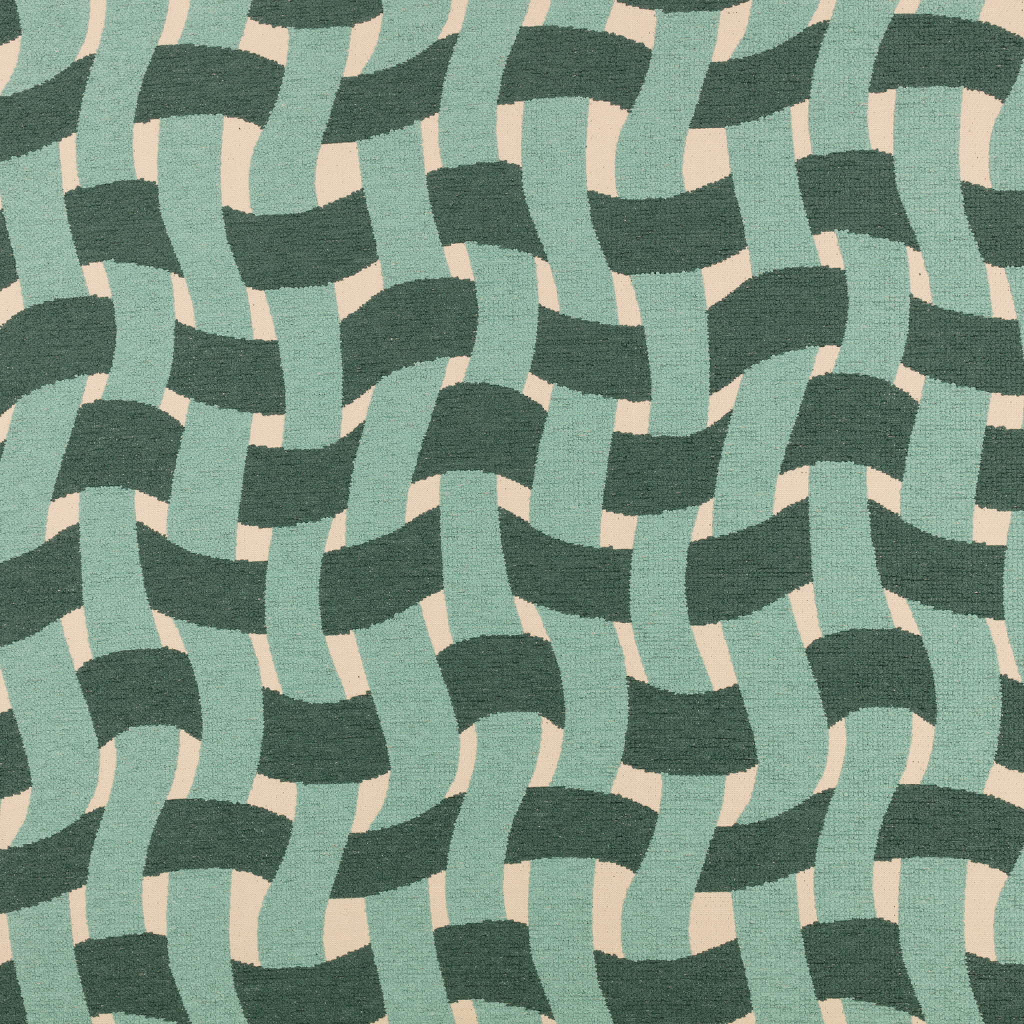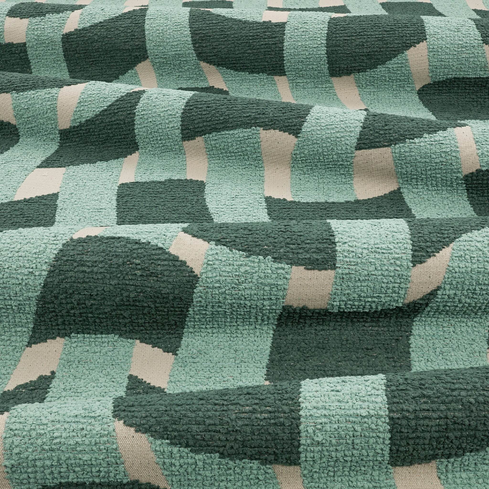 Tkanina Tide Outdoor Recycled 04 Pool to śmiałe i graficzne wzornictwo, które przypomina falujące linie i krzywe, tworząc efekt regularnego wzoru płytek zniekształconego przez wodę w basenie. Całkowity efekt tego wzoru to płynność i ruch, jakby woda stale poruszała się po powierzchni tkaniny. Bouclé o wyraźnej fakturze wyróżnia się na neutralnym tle, tworząc harmonijne połączenie kolorów.