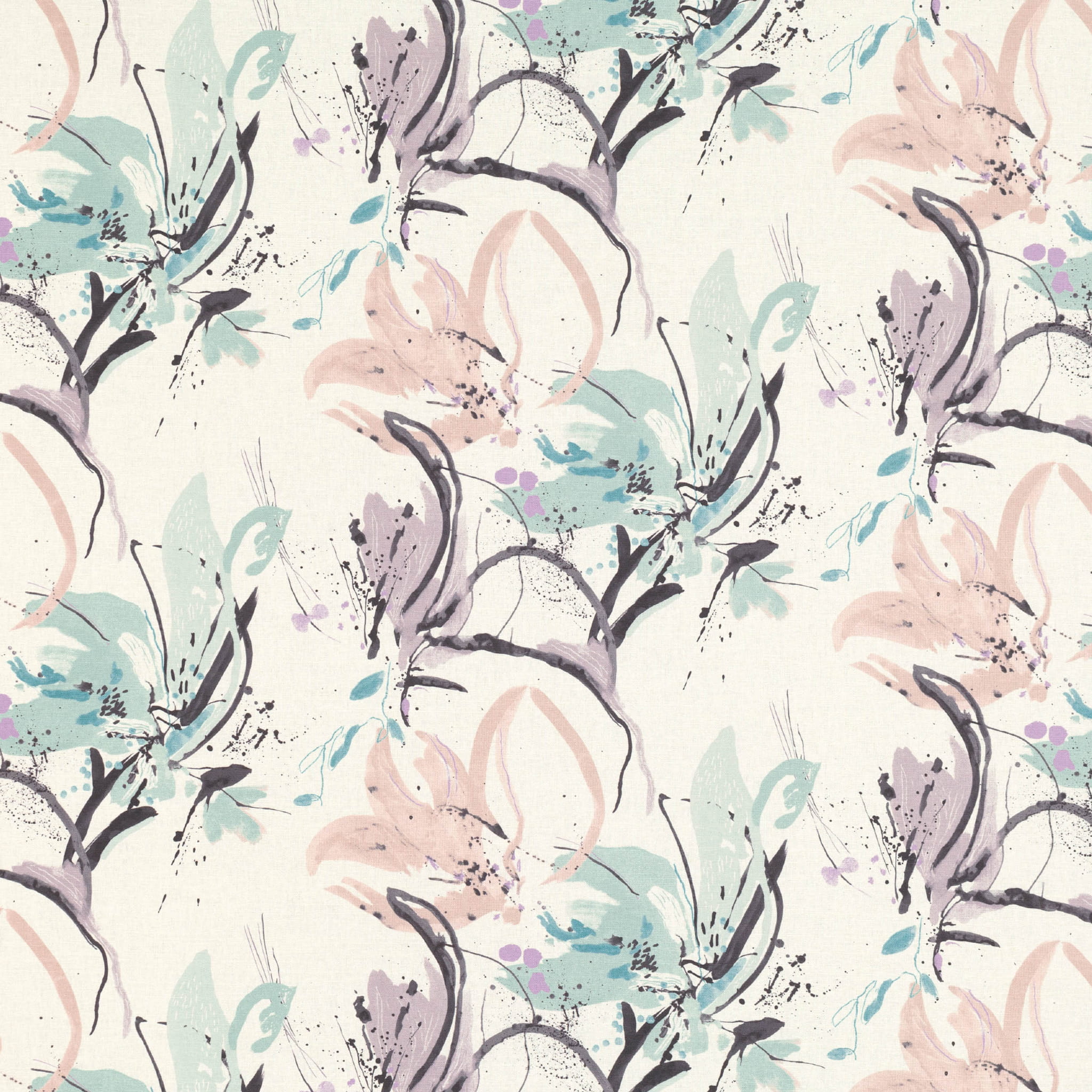 Tkanina Villa Nova 04 Artesia - Abstrakcyjne kwitnące lilie, stworzone za pomocą celowych pociągnięć pędzla, mają dynamiczny charakter. Dzięki intuicyjnym, malarskim rozpryskom, ten artystyczny wzór ma płynność i intensywność, które zostały doskonale uchwycone na tkaninie. To połączenie tworzy wrażenie ruchu i żywiołowości.