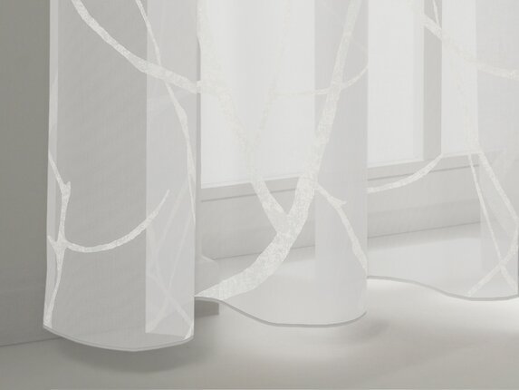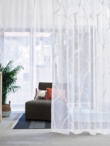 Tkanina Zimmer + Rohde 110 Candice wyróżnia się delikatnym motywem gałązek nadrukowanych na woalu burnout. Dodatkowy efekt druku nadaje wzorowi głębi i naturalnej lekkości. Strukturalna baza sprawia, że tkanina jest praktyczna, elegancka i idealna do nowoczesnych aranżacji.