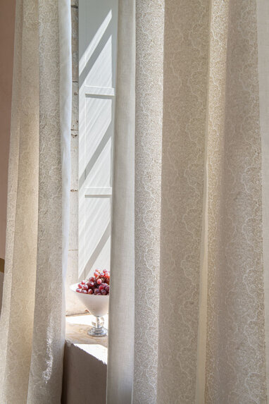 Kolekcja Arabesco od Zimmer + Rohde łączy szlachetny satynowy len z misternym haftem inspirowanym ornamentami Alhambry. Subtelnie wypukłe linie tworzą elegancki, reliefowy motyw. To tkanina o ponadczasowej lekkości i wyrafinowanej estetyce.