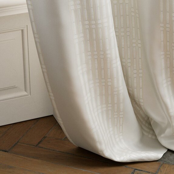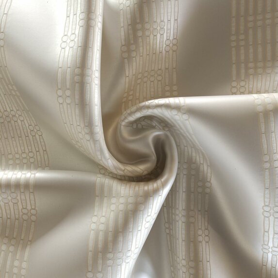 Tkanina Zimmer + Rohde 981 Bamboo wyróżnia się szerokimi blokowymi pasami na satynowej osnowie, które tworzą elegancki, biżuteryjny efekt. Brokatowy splot pięknie odbija światło, dodając dekoracji głębi i luksusu. Jej miękkie, płynne drapowanie sprawia, że doskonale sprawdza się jako zasłona, parawan lub okładzina ścienna.