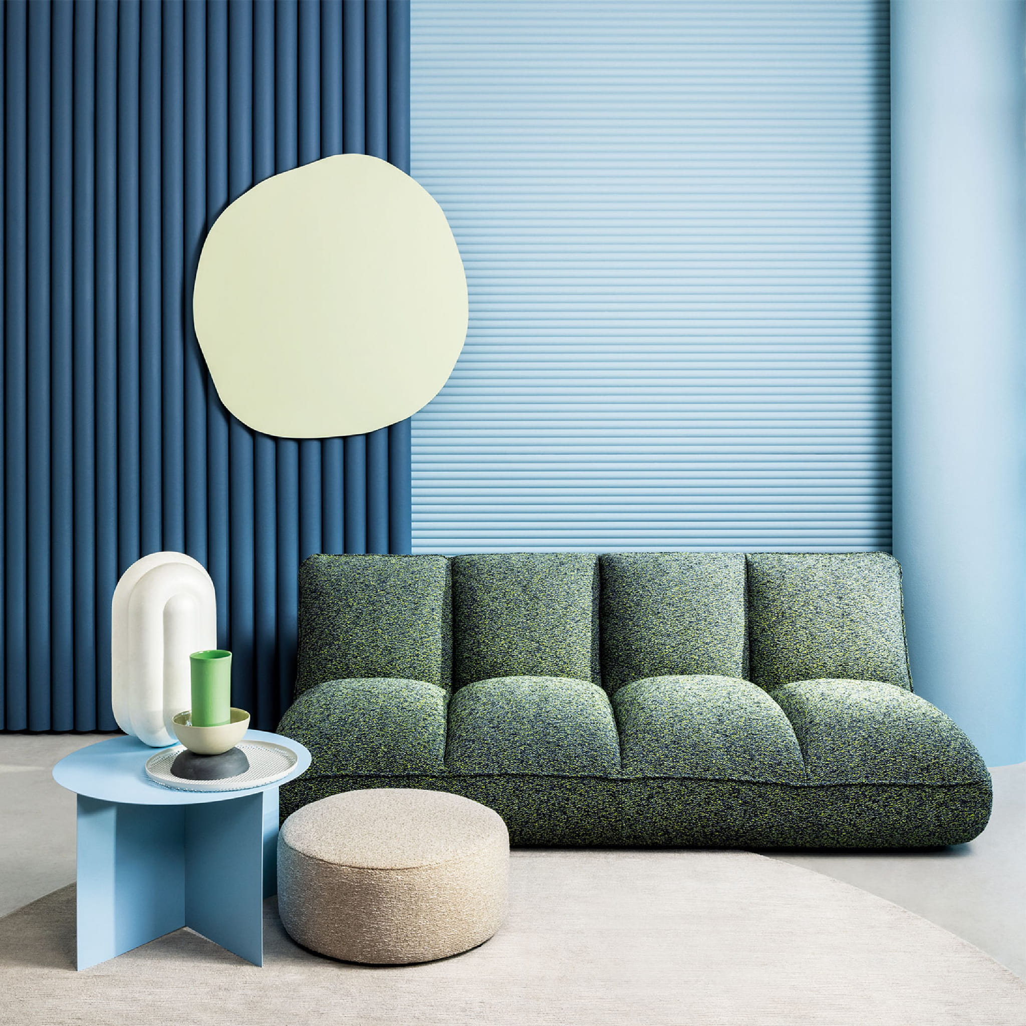 Kolekcja Spiral od kirkbydesign to innowacyjna tkanina z recyklingu. Jej miękkie, kolorowe włókna tworzą unikalny wzór. Idealna dla osób ceniących ekologię i oryginalny design.