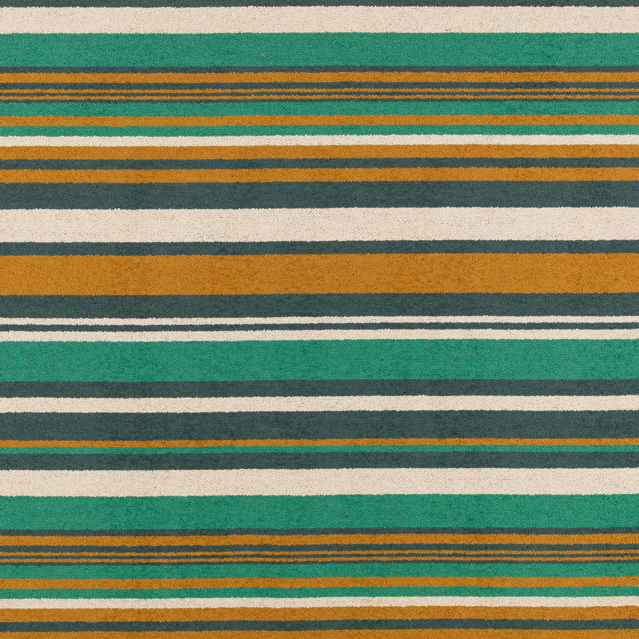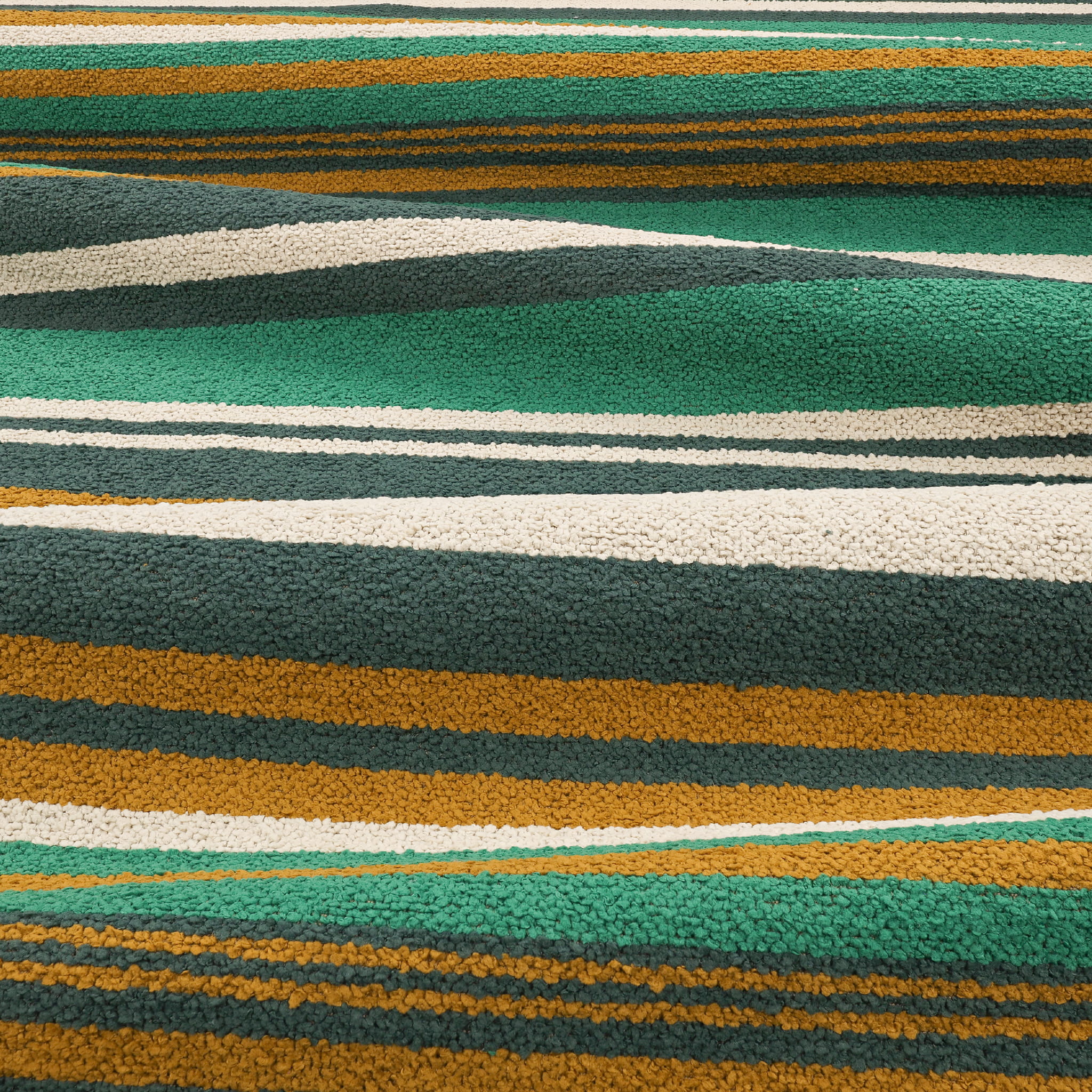 Tkanina kirkbydesign 03 Tide Outdoor Recycled wyróżnia się śmiałym wzorem i wyraźną teksturą. Nieregularne pasy w wielu kolorach są tkane z 100% przetworzonego poliestru, pochodzącego z odpadowych butelek plastikowych. Miękki bouclé dodaje tkaninie przyjemnej w dotyku faktury, a połączenie stonowanych i jasnych kolorów podkreśla jej nowoczesny charakter. Asymetryczny układ pasów nadaje tkaninie swobodny, niezobowiązujący charakter, odbiegając od symetrii tradycyjnych wzorów pasiastych.