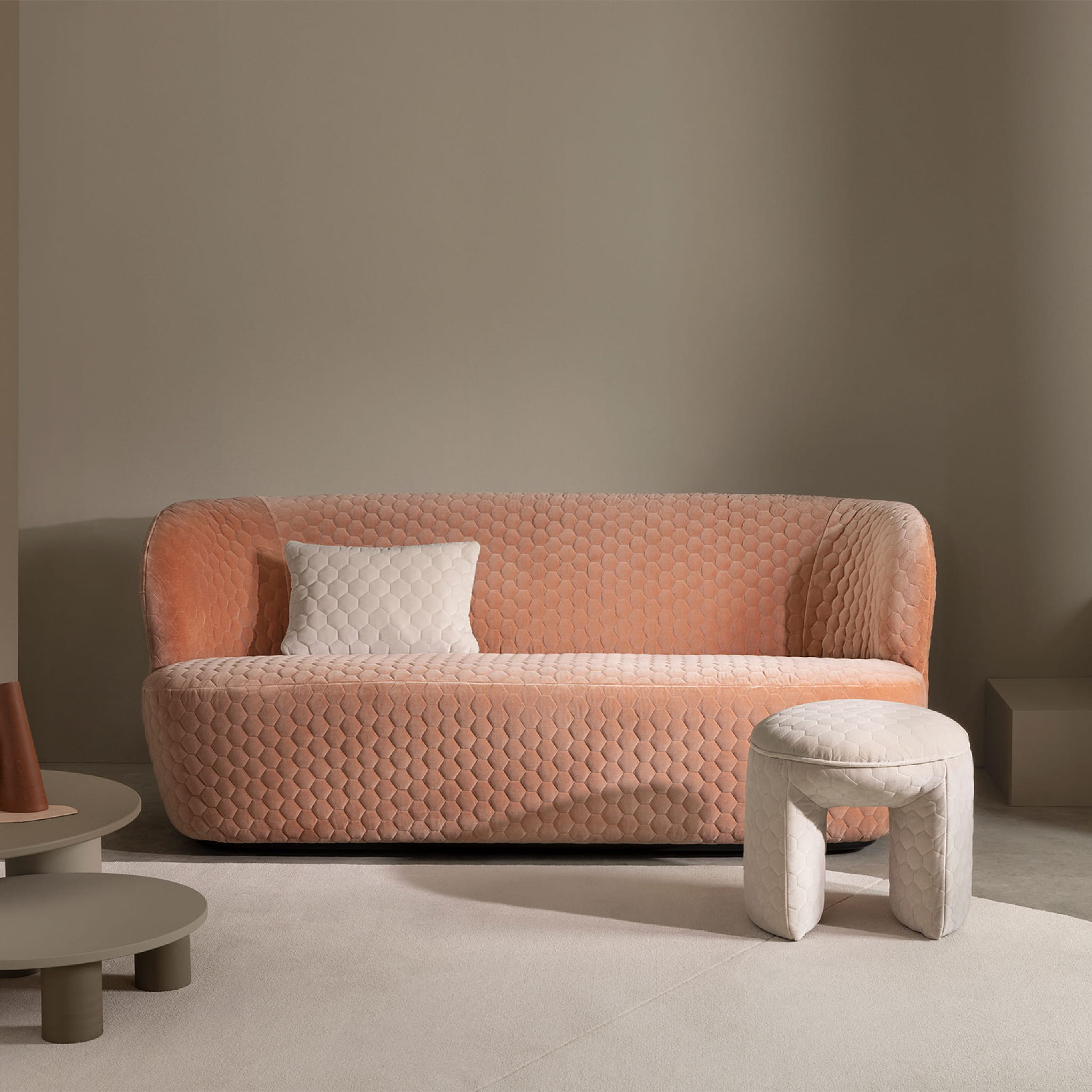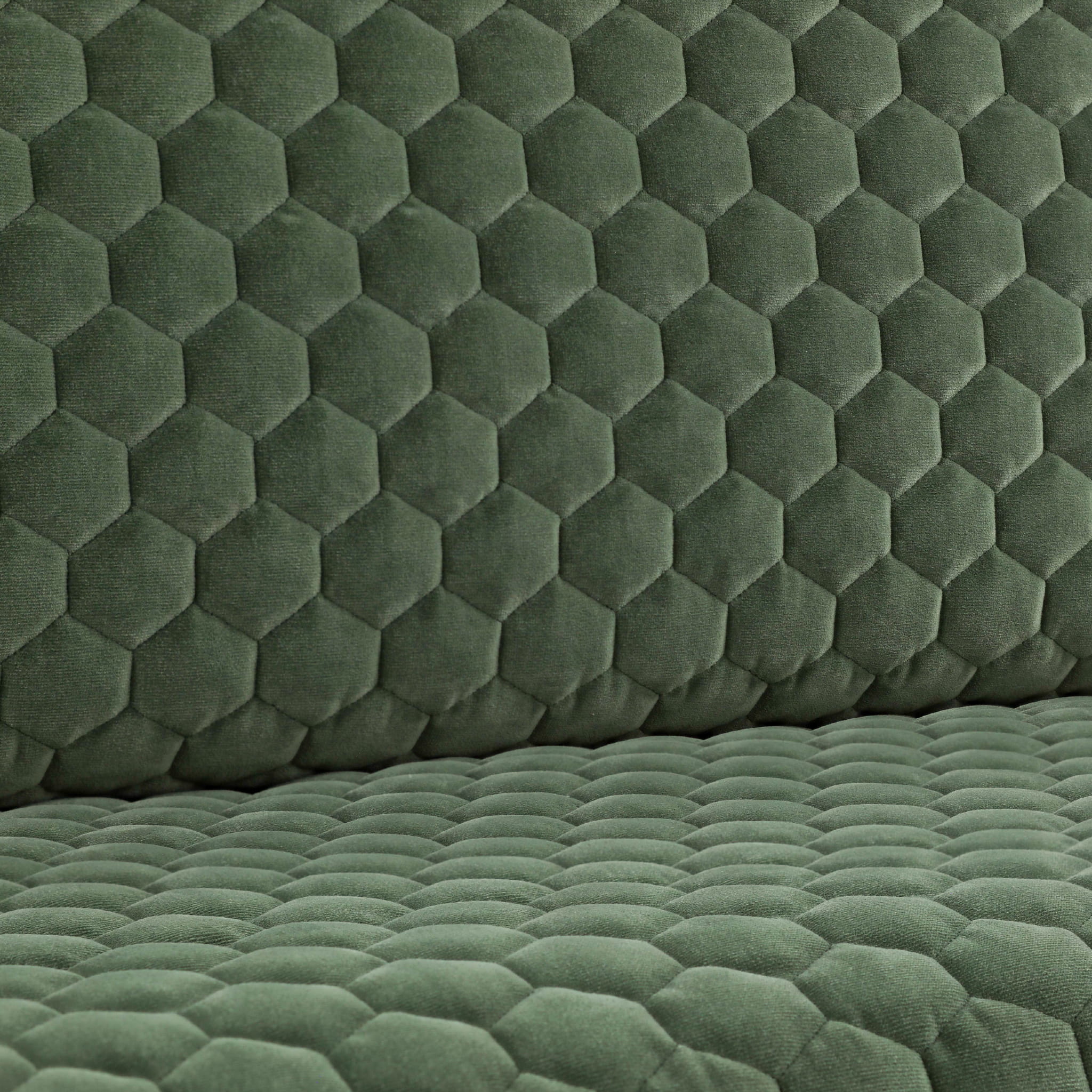 Tkanina kirkbydesign 59 Cloud II FR to trójwymiarowy welur o graficznej, sześciokątnej strukturze, który został dodatkowo upiększony poprzez potrójne pikowanie, nadając mu luksusowy charakter.